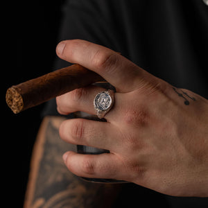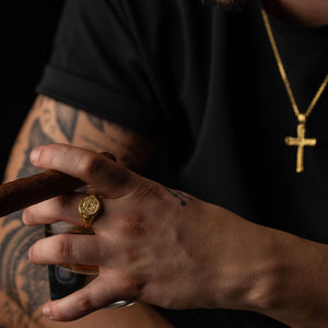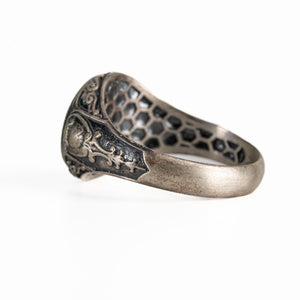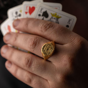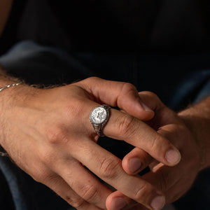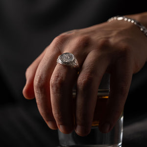 Handcrafted men's coat of arms signet, meticulously polished with bold relief and substantial weight, showcasing heirloom-quality craftsmanship and a refined silhouette that complements both casual and formal wardrobes.