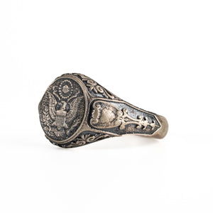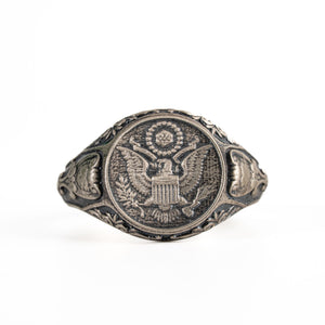 Inspired by the American coat of arms, the eagle and shield motif evokes courage, sovereignty, and familial duty, blending classical heraldry with contemporary aesthetics for enduring symbolic resonance.
