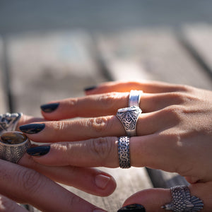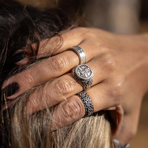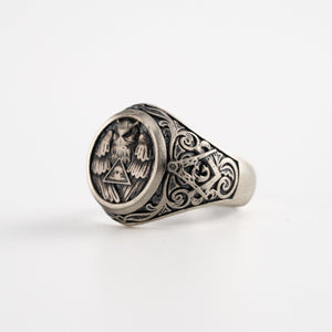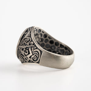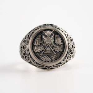 Handmade Athena Owl signet ring, sculpted in 925 sterling silver with finely oxidized details and polished accents, offers timeless craftsmanship, bold presence, and a refined statement for everyday or ceremonial wear.