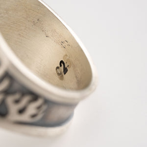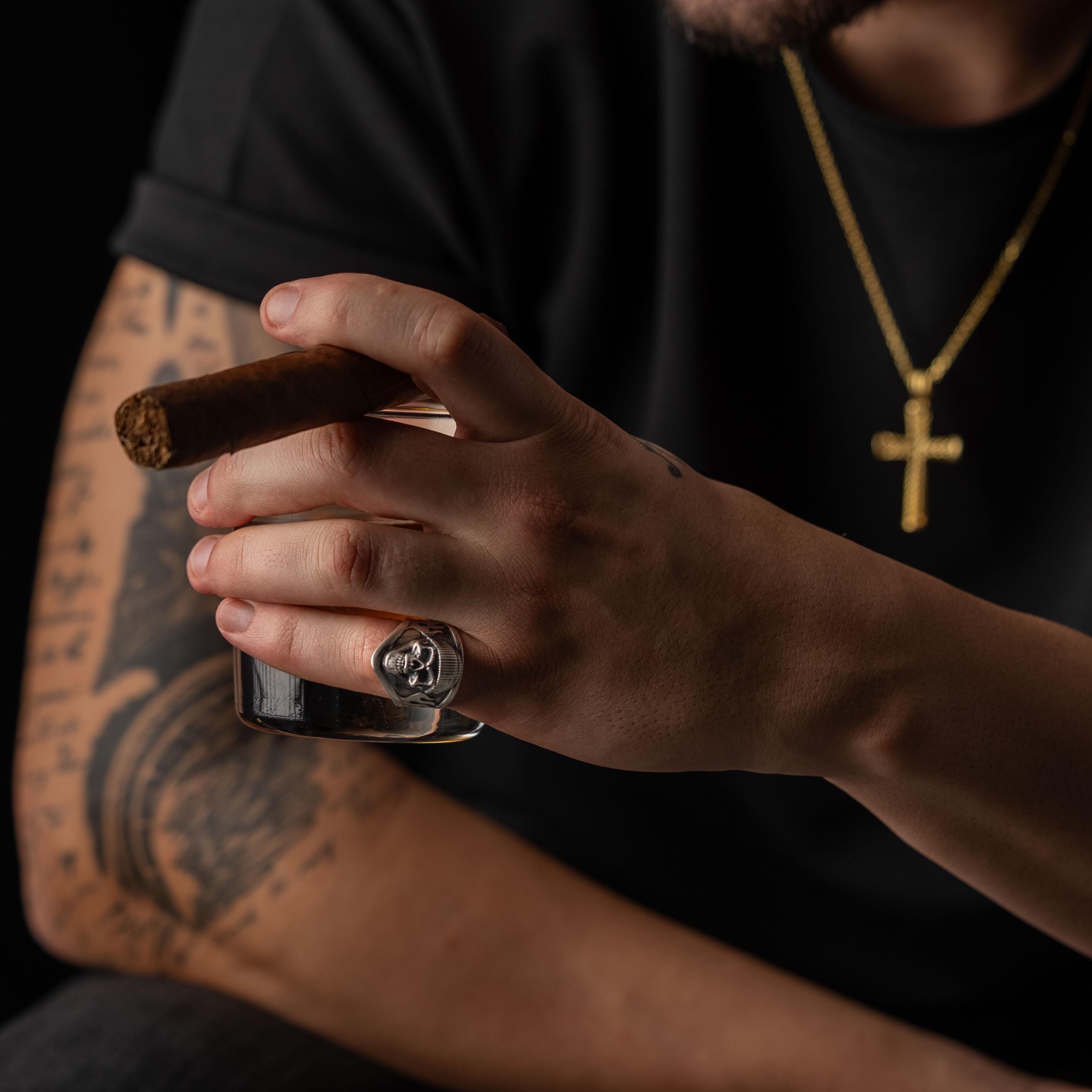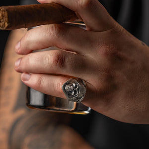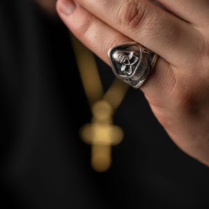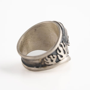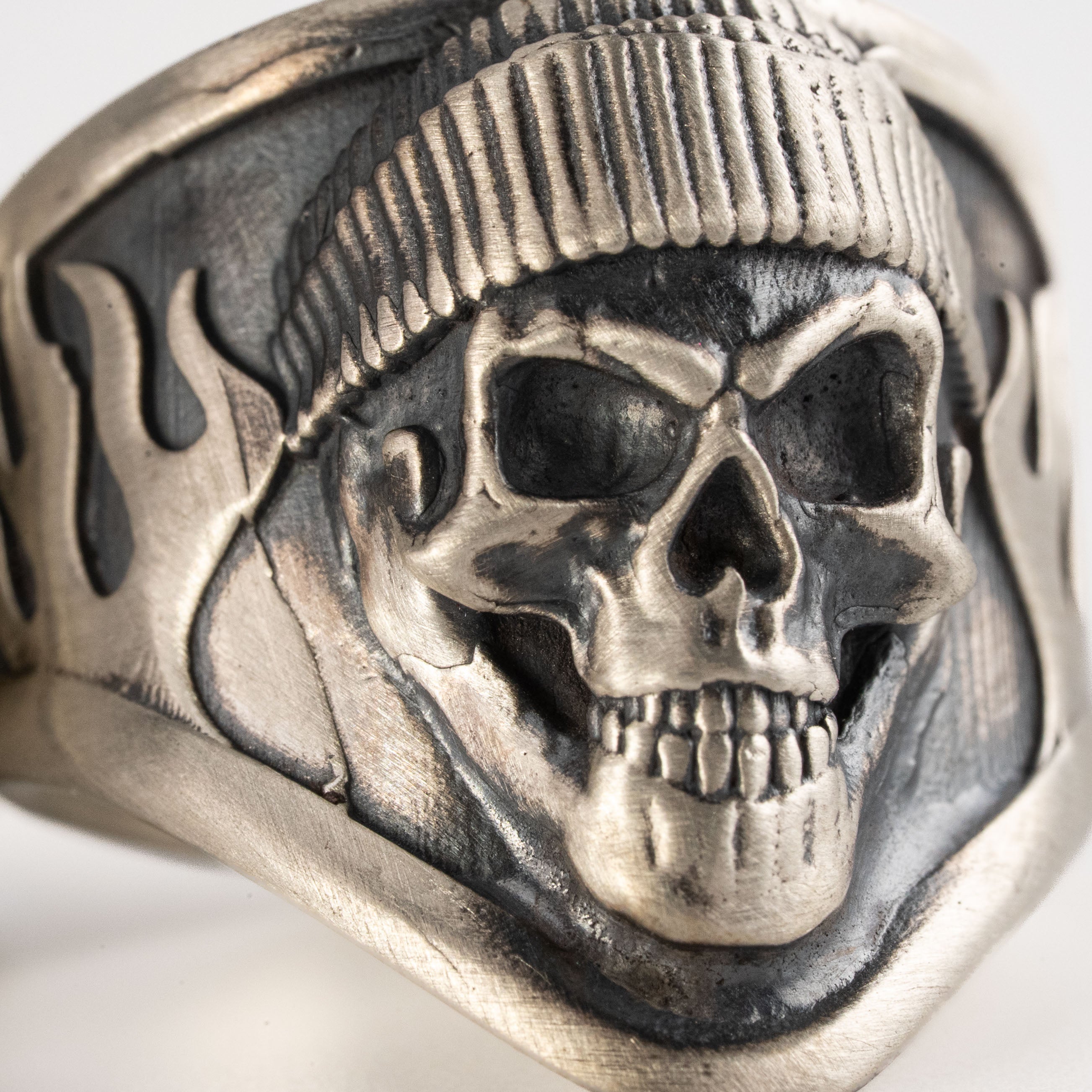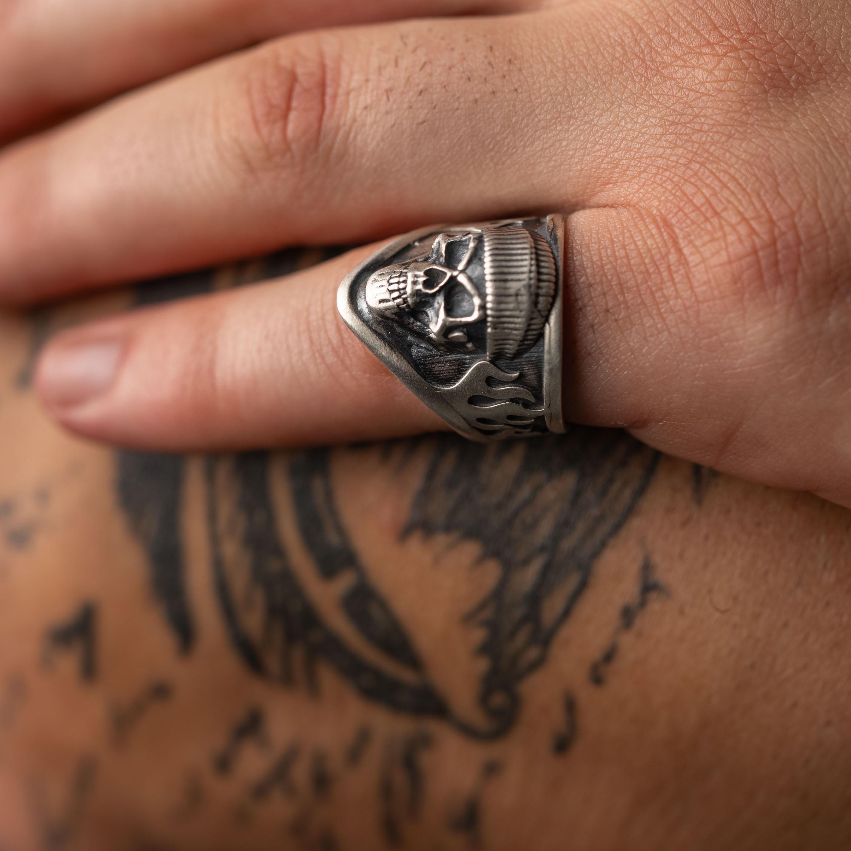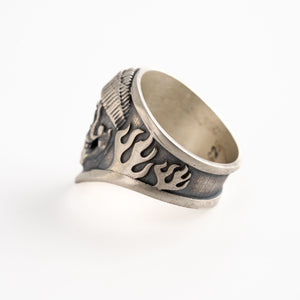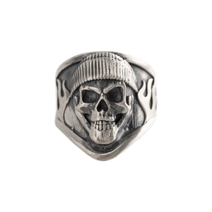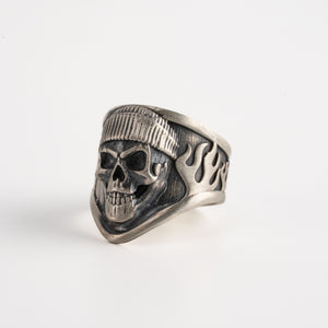 This ring features an intricate figurative skull silhouette integrated with a flame structural profile, incorporating high-definition surface textures and a multi-dimensional relief depth. The design highlights professional-grade finishing techniques, creating a sharp visual contrast between high-polished surface highlights and specialized oxidized recesses that define the complex metalwork and urban-inspired iconography. Engineered for a bold unisex volume and material integrity in 925 sterling silver, this accessory provides a refined contemporary look focused on technical execution and durable craftsmanship for consistent daily wear.