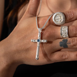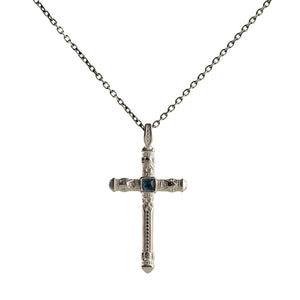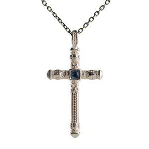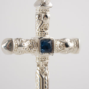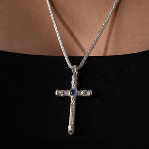 The crucifix form evokes ancient protective traditions, channeling balance, directionality, and quiet resilience; the blue stone symbolizes wisdom and inner calm, anchoring the wearer in lineage and purpose.