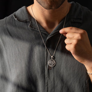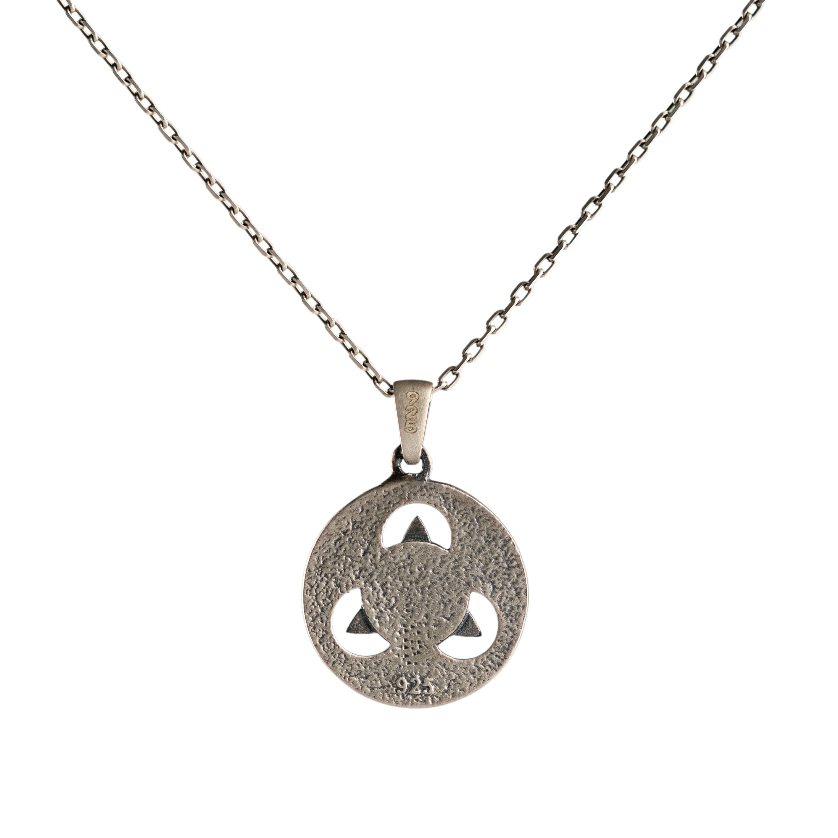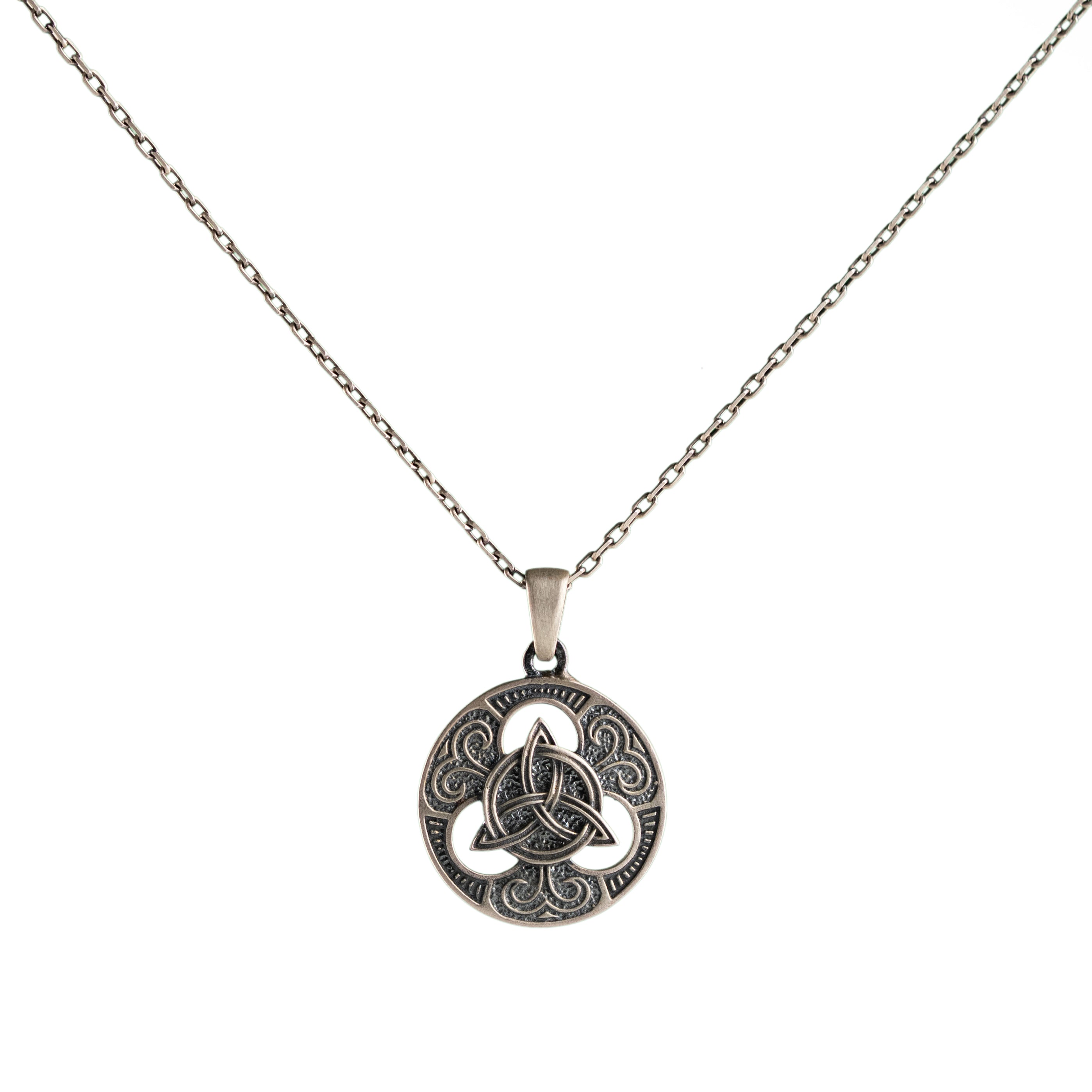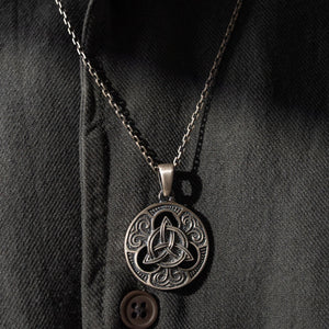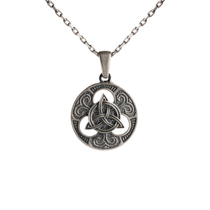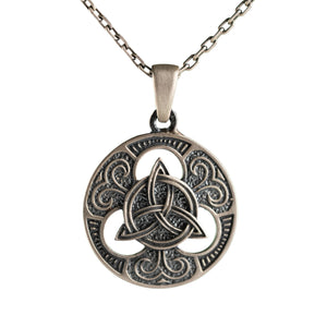 This necklace features an intricate figurative Triquetra knot motif, incorporating high-definition interlaced textures and a multi-dimensional structural profile. The design highlights professional-grade finishing techniques, creating a sharp visual contrast between high-polished surface highlights and specialized oxidized recesses that define the complex metalwork and traditional Celtic iconography. Engineered for a balanced weight and material integrity in 925 sterling silver, this accessory provides a refined contemporary look focused on technical execution and durable craftsmanship for consistent daily wear.