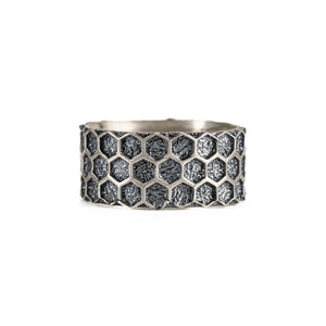 This custom ring features a precise hexagonal pattern with polished surface highlights and structured geometric motifs. The design emphasizes architectural symmetry and technical precision, offering a consistent luster and durable profile for versatile daily wear. Focused on material integrity and refined metalwork, this customizable accessory provides specialized personalization options to highlight individual details within its multi-dimensional surface textures and professional finish.