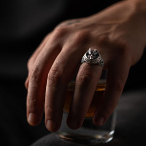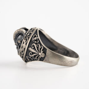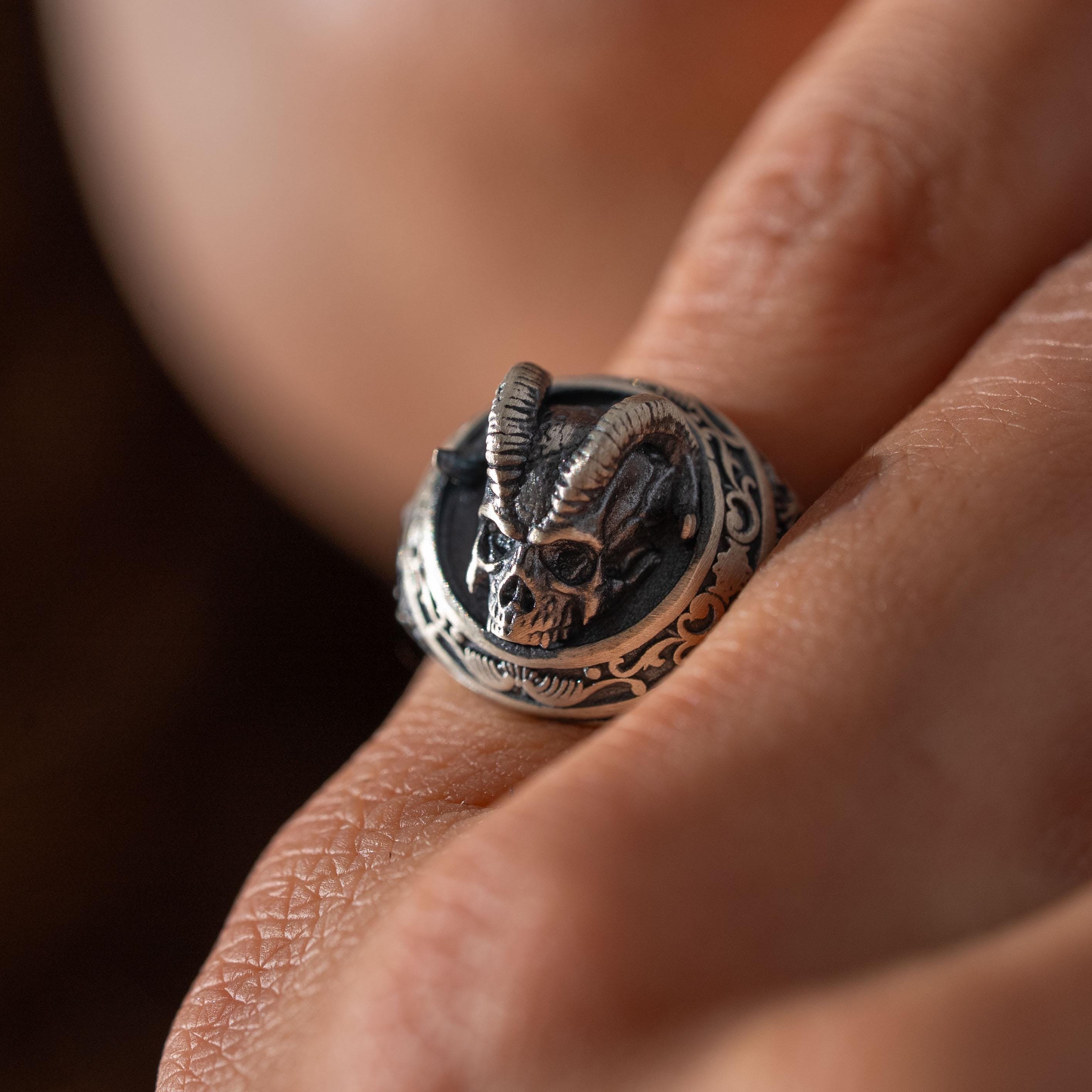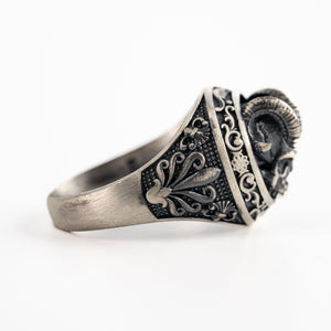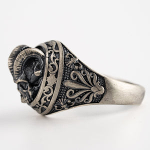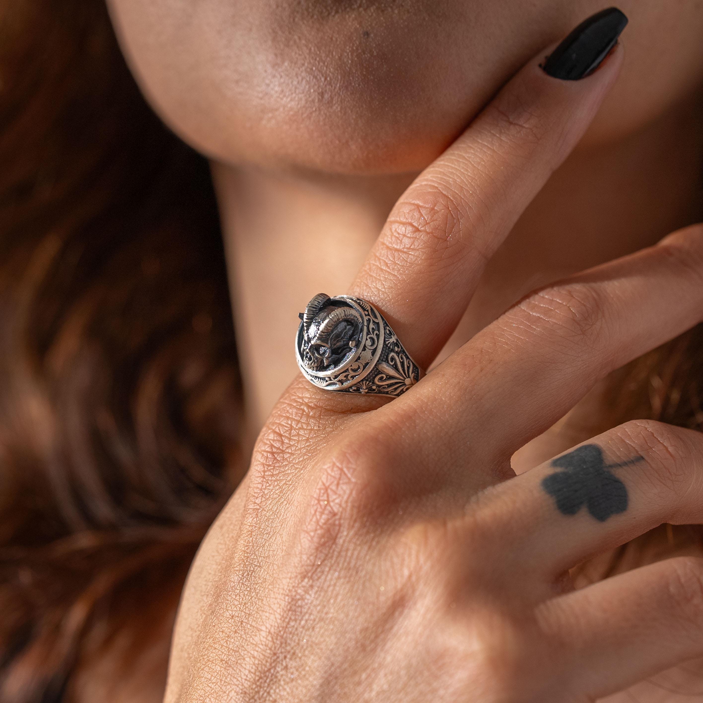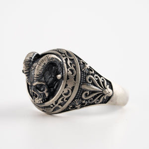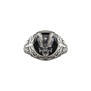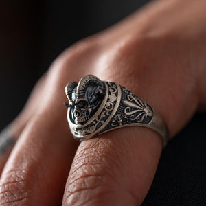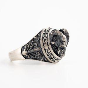 This ring features an intricate figurative goat skull silhouette integrated with elongated horn structural profiles, incorporating high-definition surface textures and a multi-dimensional relief depth. The design highlights professional-grade finishing techniques, creating a sharp visual contrast between high-polished surface highlights and specialized oxidized recesses that define the complex metalwork and Gothic-inspired iconography. Engineered for a commanding volume and material integrity in 925 sterling silver, this accessory provides a refined contemporary look focused on technical execution and durable craftsmanship for consistent daily wear.