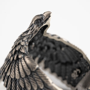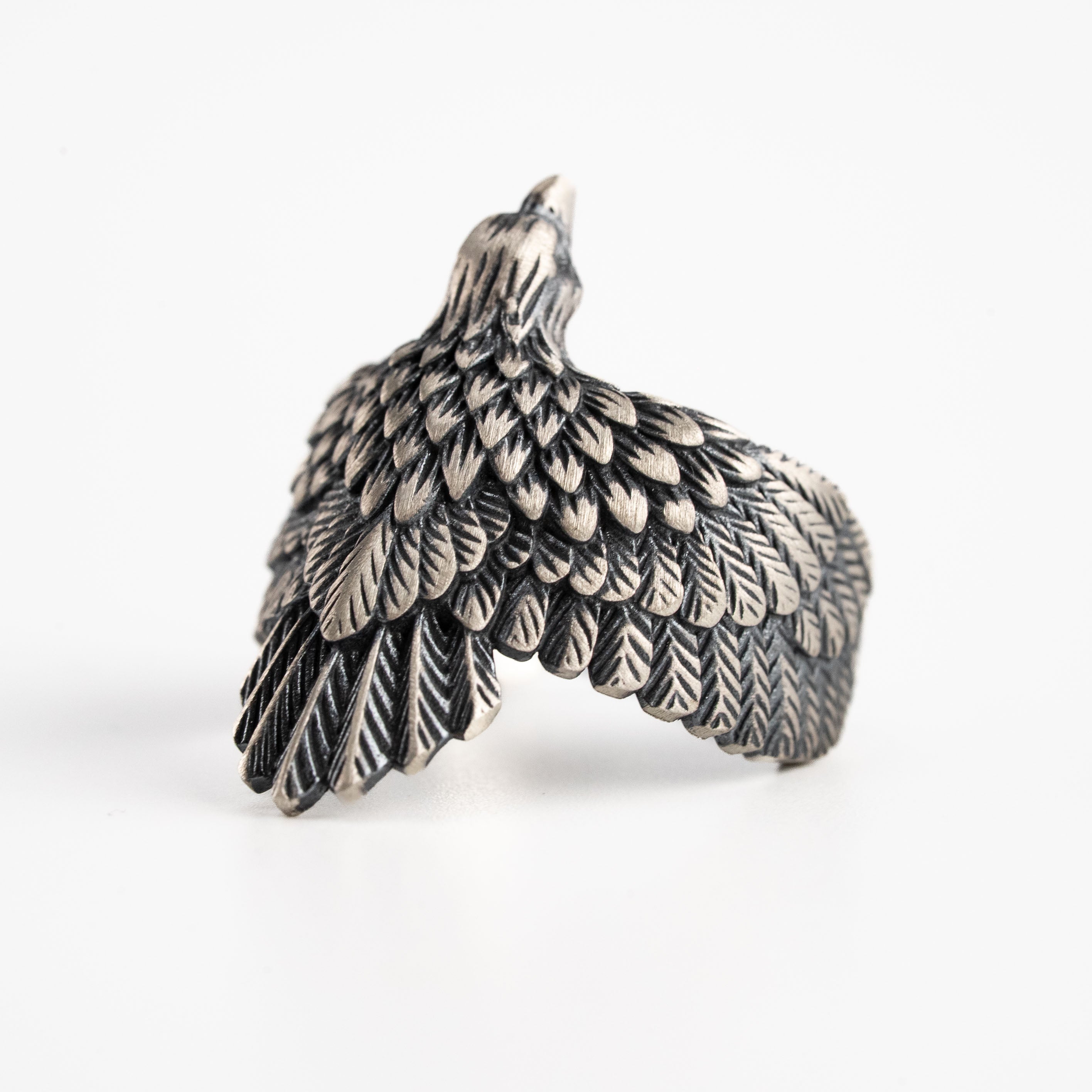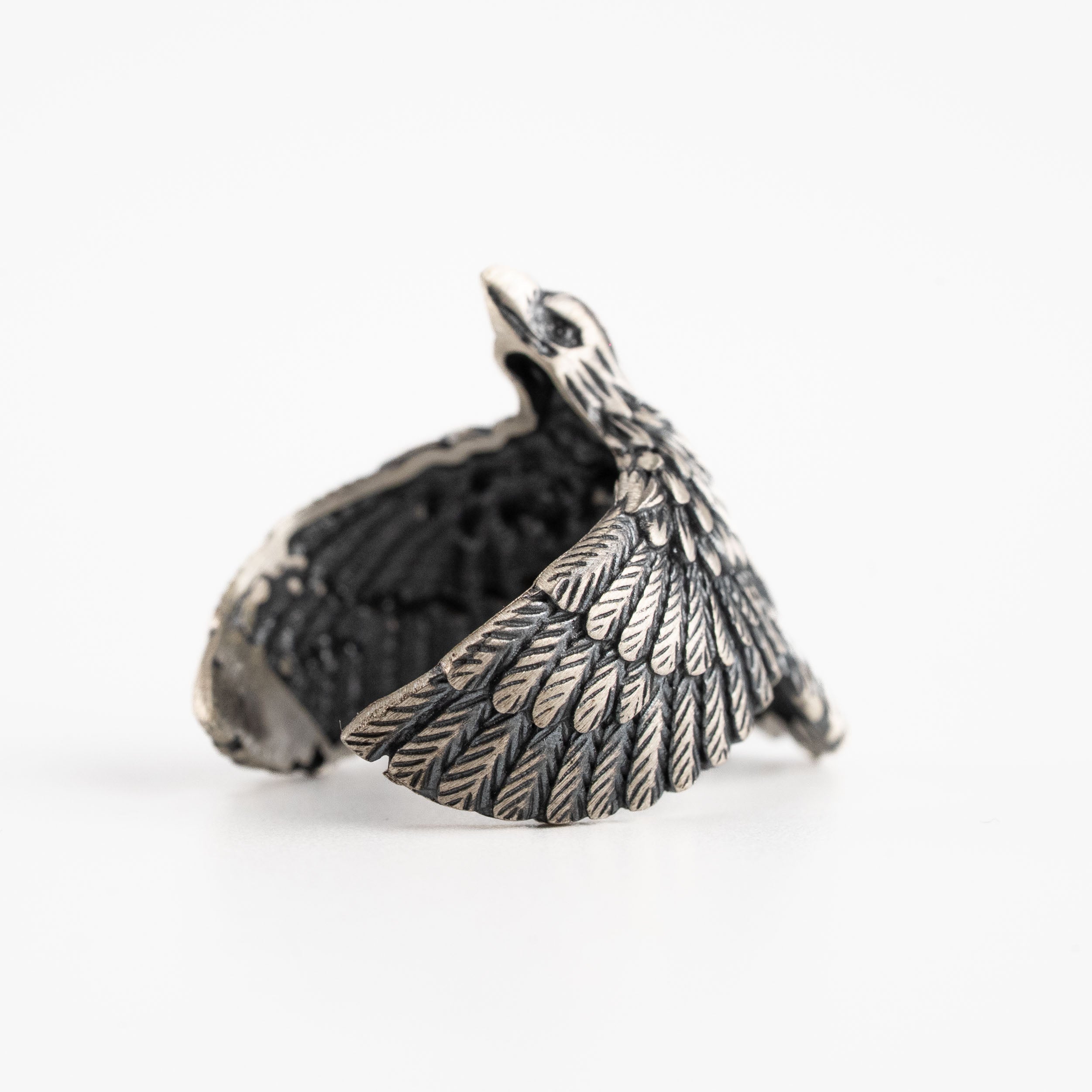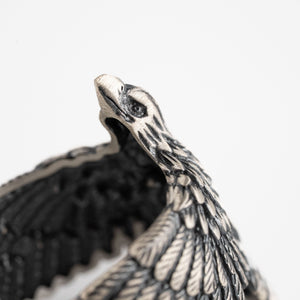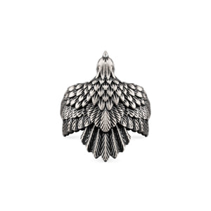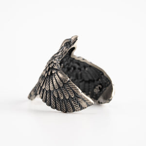 This ring features an intricate figurative wing motif, incorporating high-definition feather textures and a multi-dimensional structural profile. The design highlights professional-grade finishing techniques, creating a sharp visual contrast between high-polished surface highlights and specialized recessed accents that define the complex metalwork and avian iconography. Engineered for a balanced weight and material integrity in 925 sterling silver, this accessory provides a refined contemporary look focused on technical execution and durable craftsmanship for consistent daily wear.