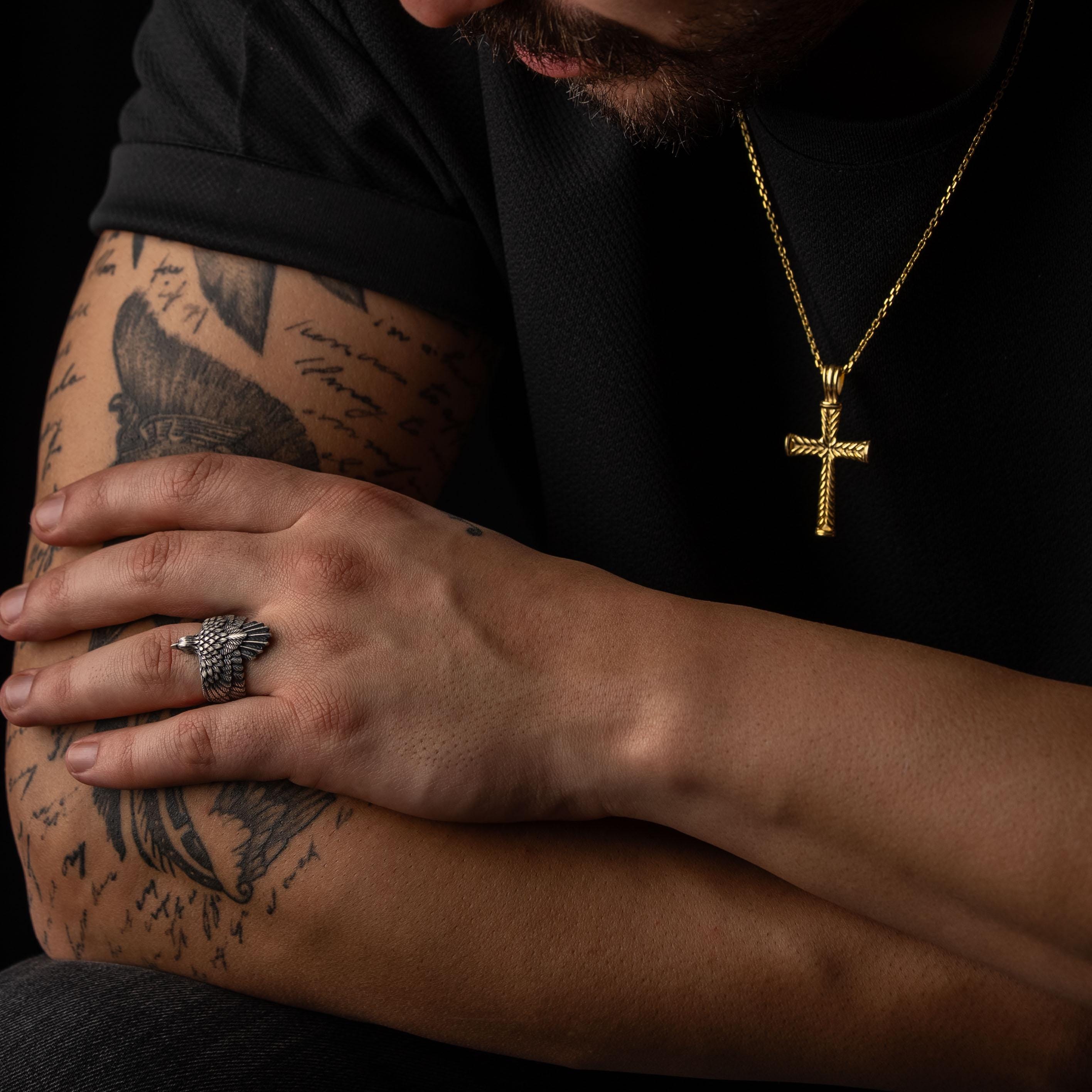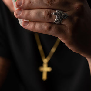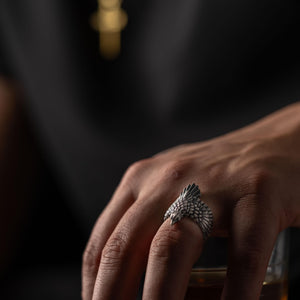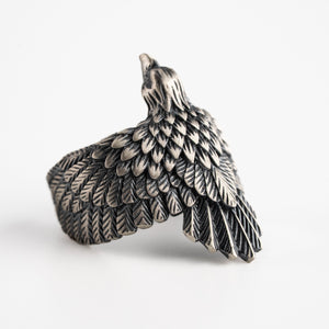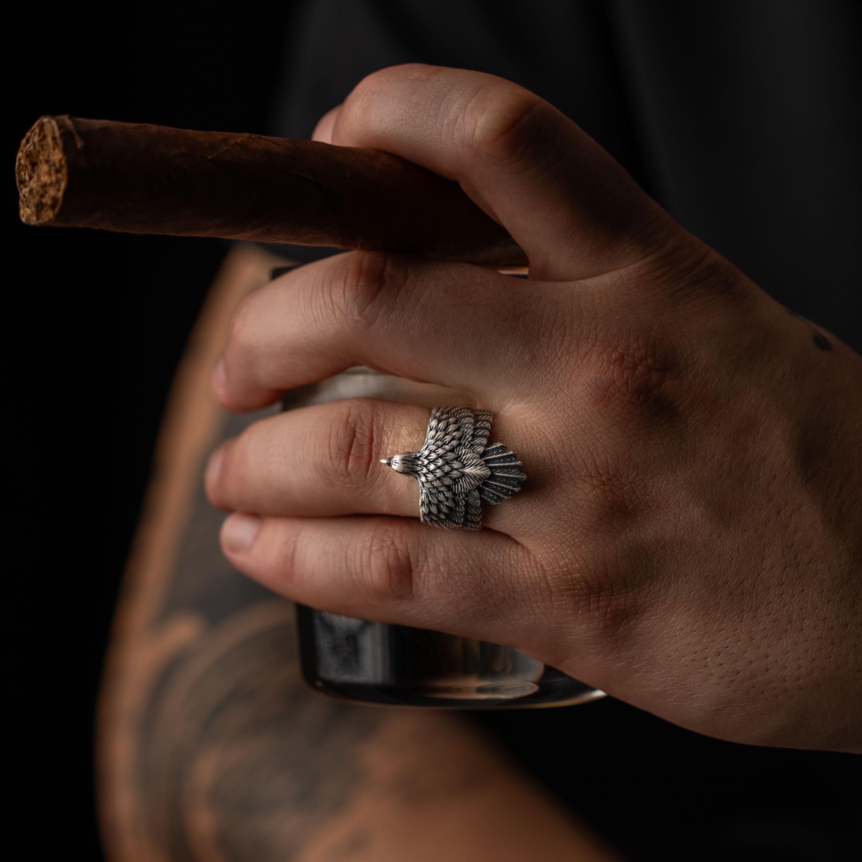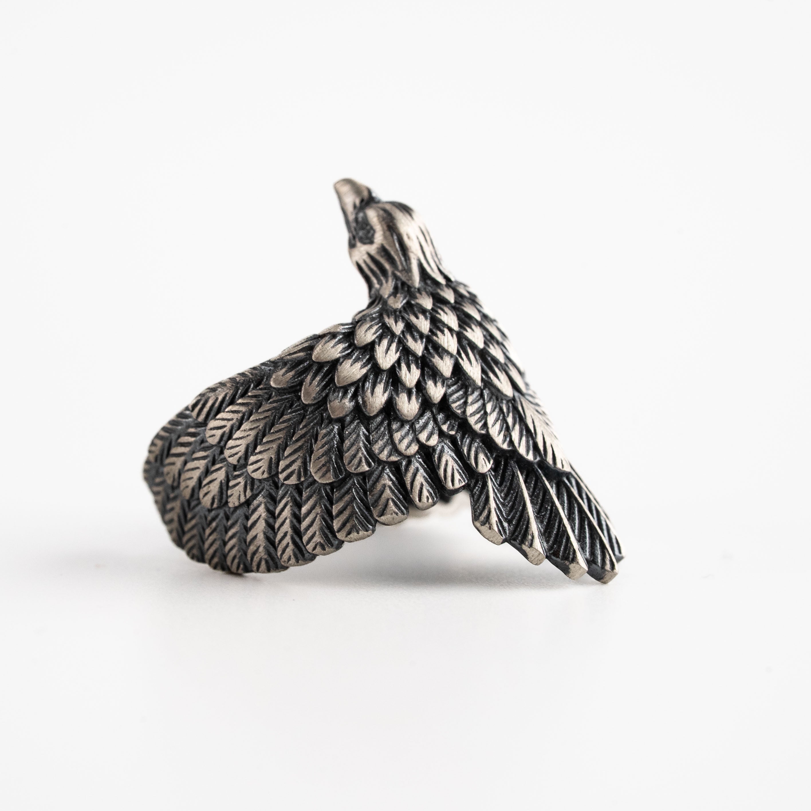 This ring features an intricate figurative wing motif, incorporating high-definition feather textures and a multi-dimensional structural profile. The design highlights professional-grade finishing techniques, creating a sharp visual contrast between high-polished surface highlights and specialized recessed accents that define the complex metalwork and avian iconography. Engineered for a balanced weight and material integrity in 925 sterling silver, this accessory provides a refined contemporary look focused on technical execution and durable craftsmanship for consistent daily wear.