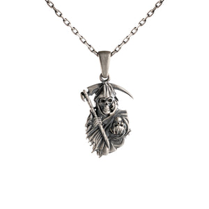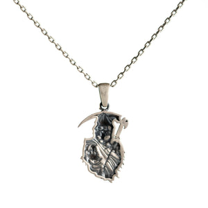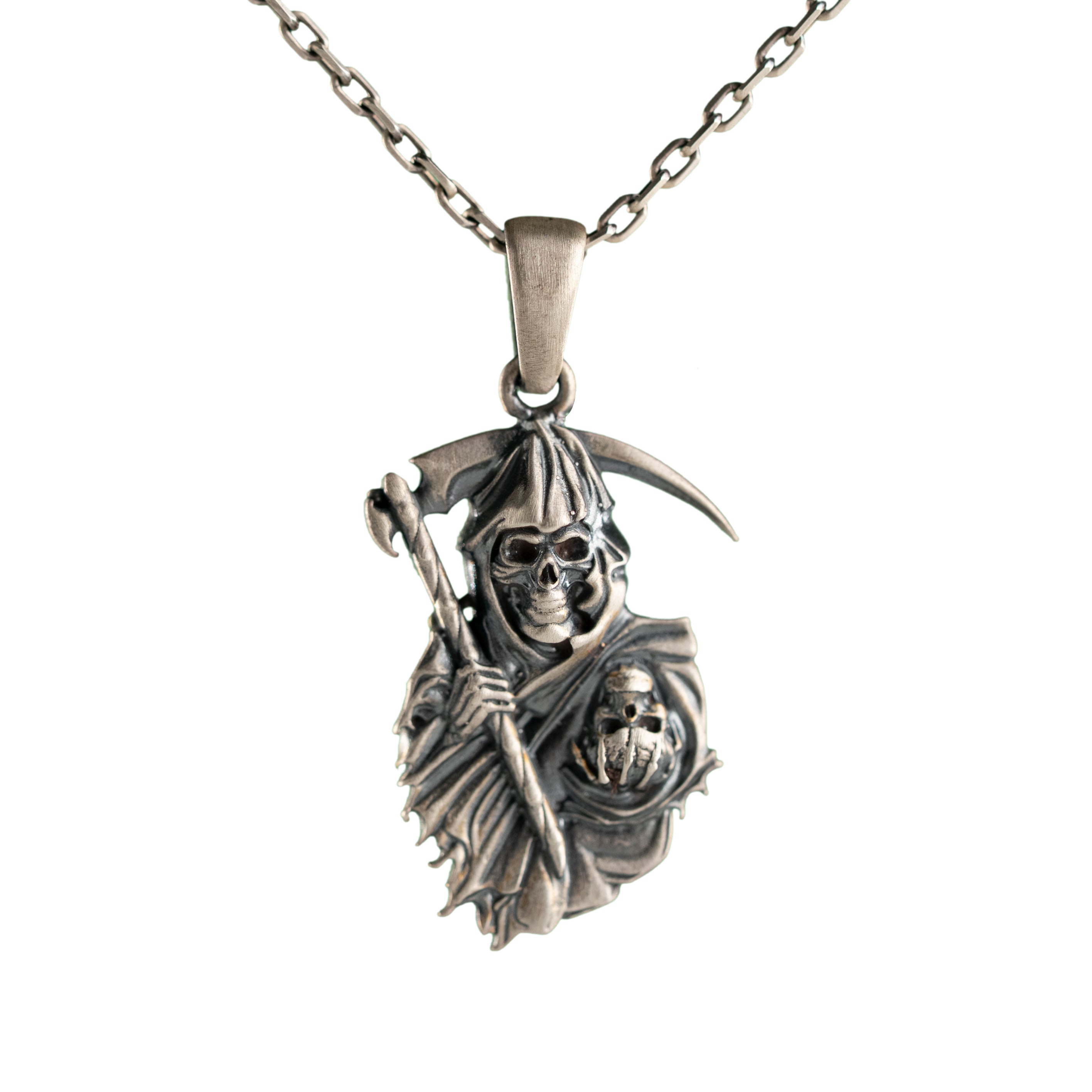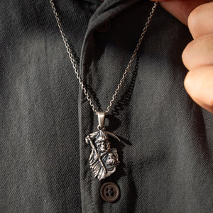 This necklace features an intricate figurative Grim Reaper silhouette integrated with a scythe structural profile, incorporating high-definition relief textures and a multi-dimensional surface depth. The design highlights professional-grade finishing techniques, creating a sharp visual contrast between high-polished surface highlights and specialized oxidized recesses that define the complex metalwork and medieval iconography. Engineered for material integrity in 925 sterling silver, this accessory provides a refined contemporary look focused on technical execution and durable craftsmanship for consistent daily wear.