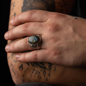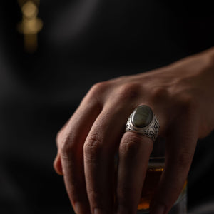 This ring features an intricate figurative oval silhouette integrated with a green iridescent stone setting, incorporating high-definition surface textures and a multi-dimensional structural profile inspired by Mediterranean and Ottoman iconography. The design highlights professional-grade finishing techniques, creating a sharp visual contrast between high-polished surface highlights and specialized oxidized recesses that define the complex metalwork and traditional engravings. Engineered for a bold unisex volume and material integrity in 925 sterling silver, this accessory provides a refined contemporary look focused on technical execution and durable craftsmanship for consistent daily wear.