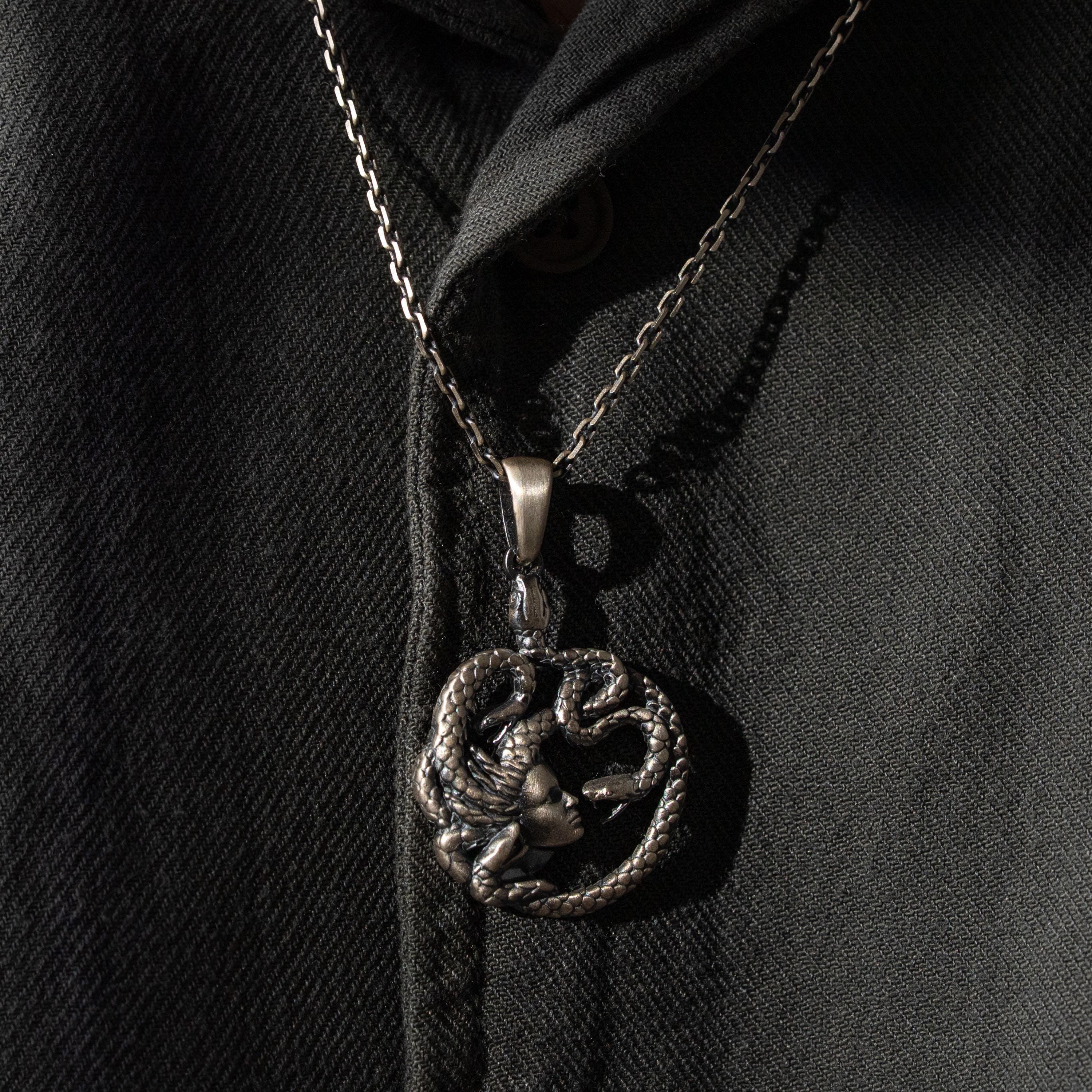 Handcrafted in 925 sterling silver, this Medusa pendant melds intricate snake detailing with a bold, gothic silhouette, offering lasting shine, refined weight, and artisan finish for everyday elegance.
