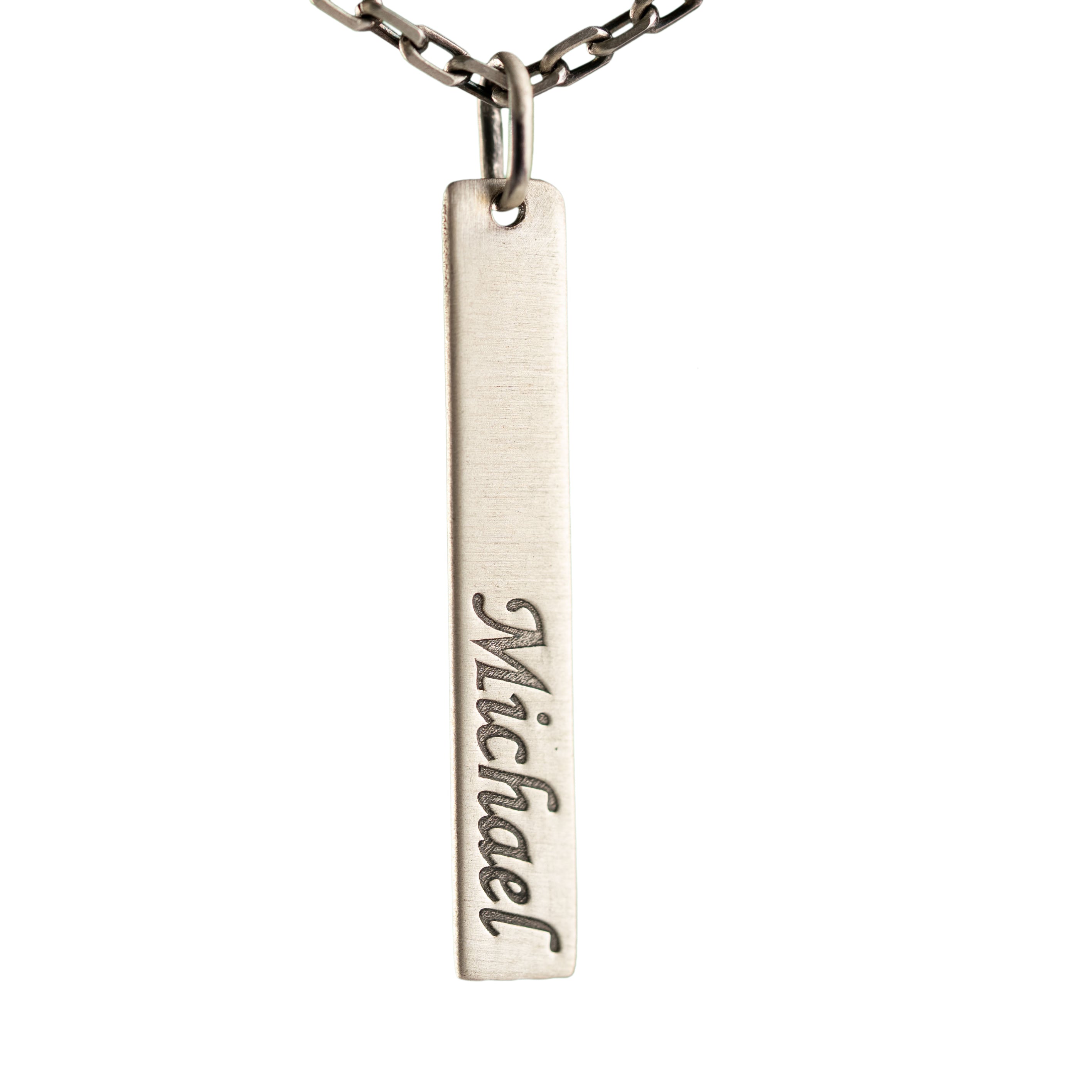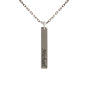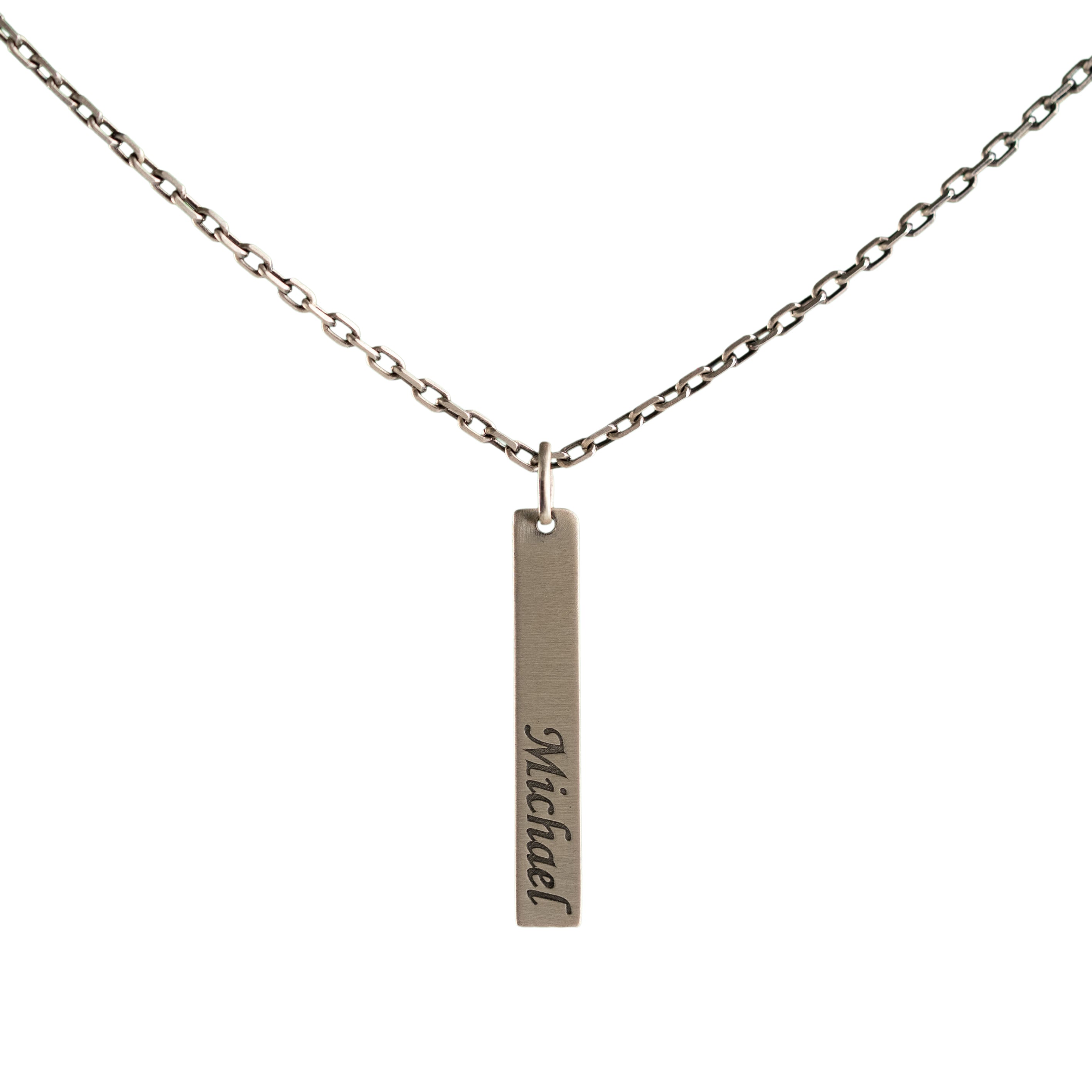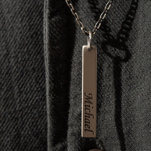 This personalized necklace features a minimalist linear bar profile with high-precision custom engraving and high-definition surface textures. The design highlights professional-grade finishing techniques, offering a sharp visual contrast between high-polished surface highlights and refined structural elements. Engineered for a balanced weight and material integrity, this customizable accessory provides a sleek contemporary profile focused on technical execution and durable craftsmanship for versatile daily wear.
