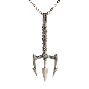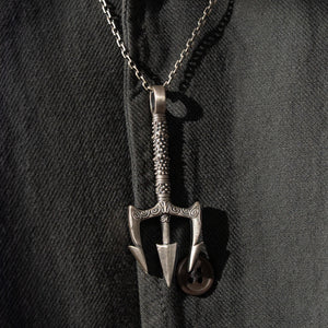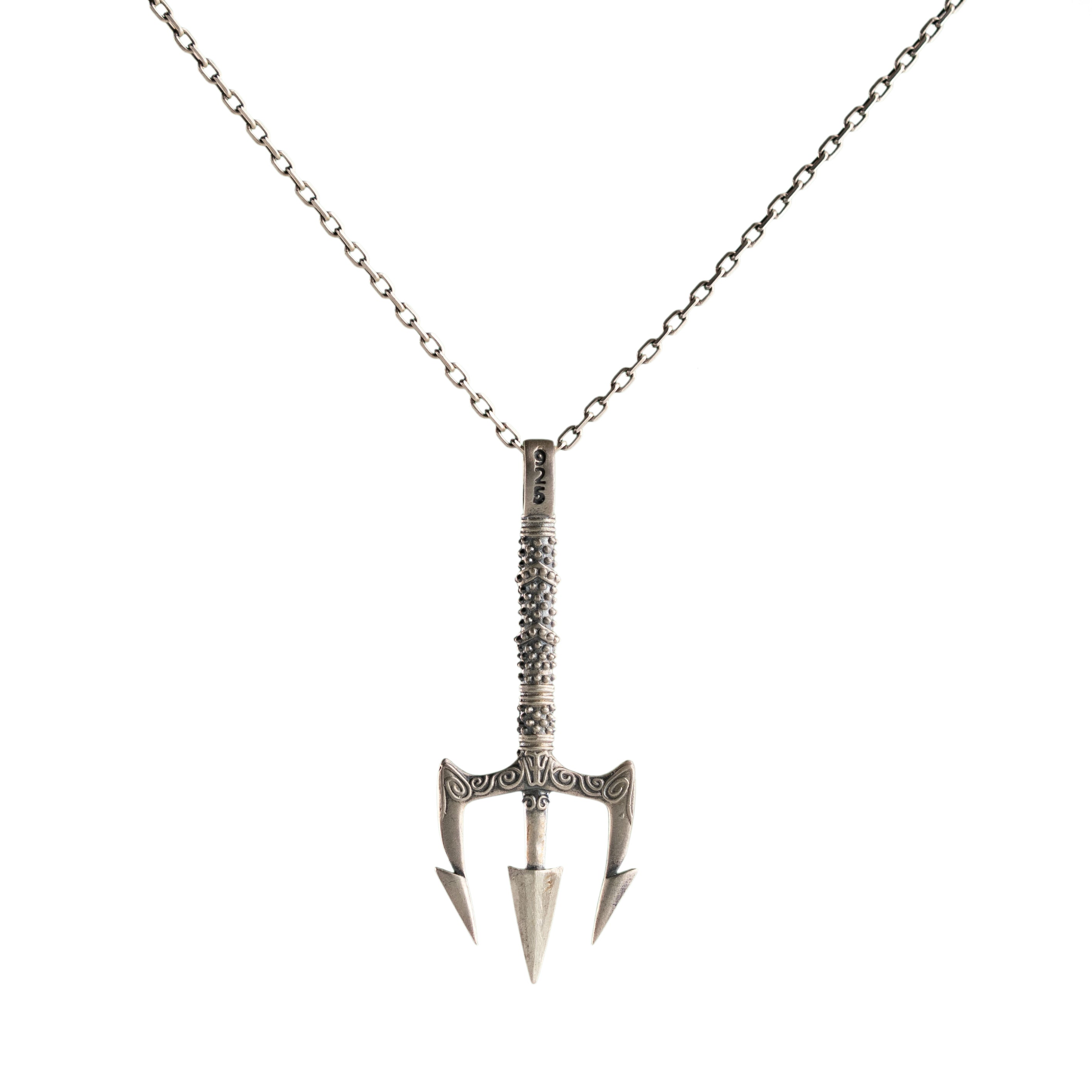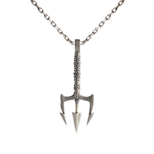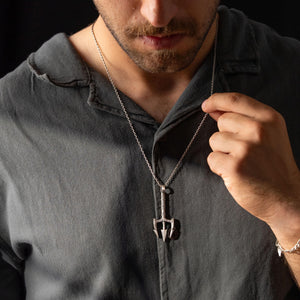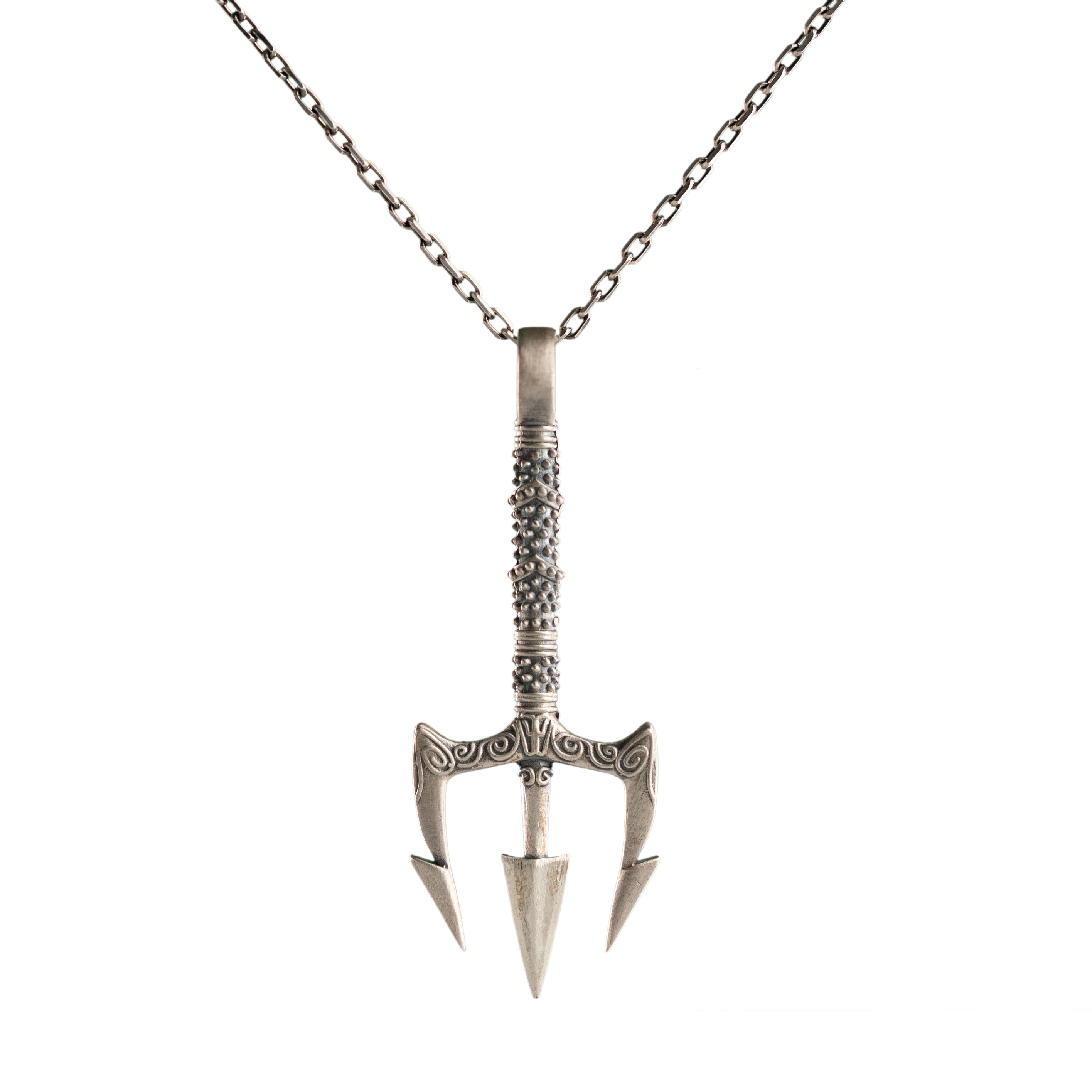 This necklace features a detailed three-pronged structural relief with high-definition surface textures and a multi-dimensional silhouette. The design incorporates professional-grade finishing techniques to create a sharp visual contrast between high-polished highlights and specialized oxidized recesses, emphasizing the structural depth of the metalwork. Engineered for a substantial presence and a balanced weight, this accessory provides a refined contemporary profile focused on technical execution and material integrity for versatile daily wear.