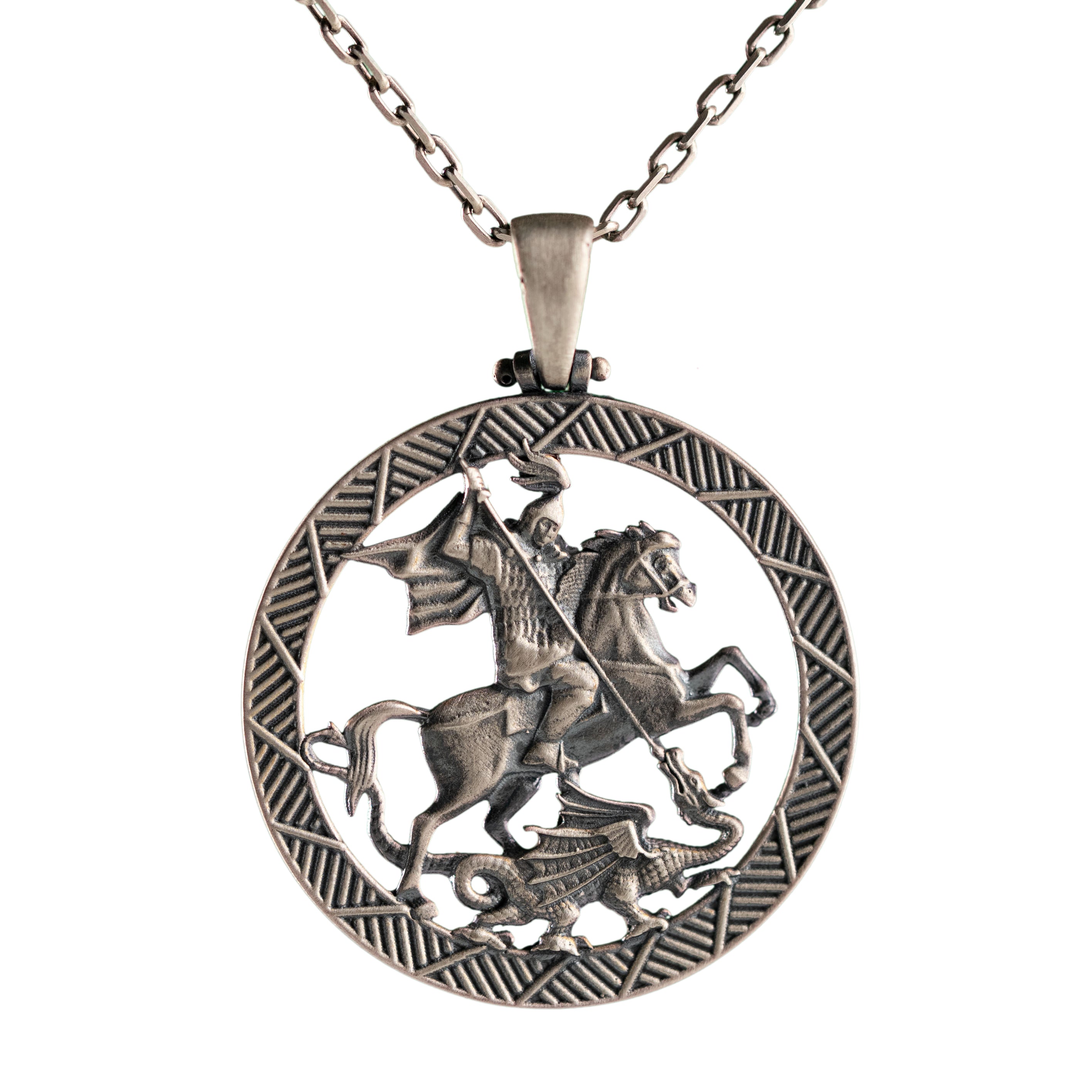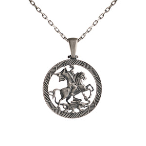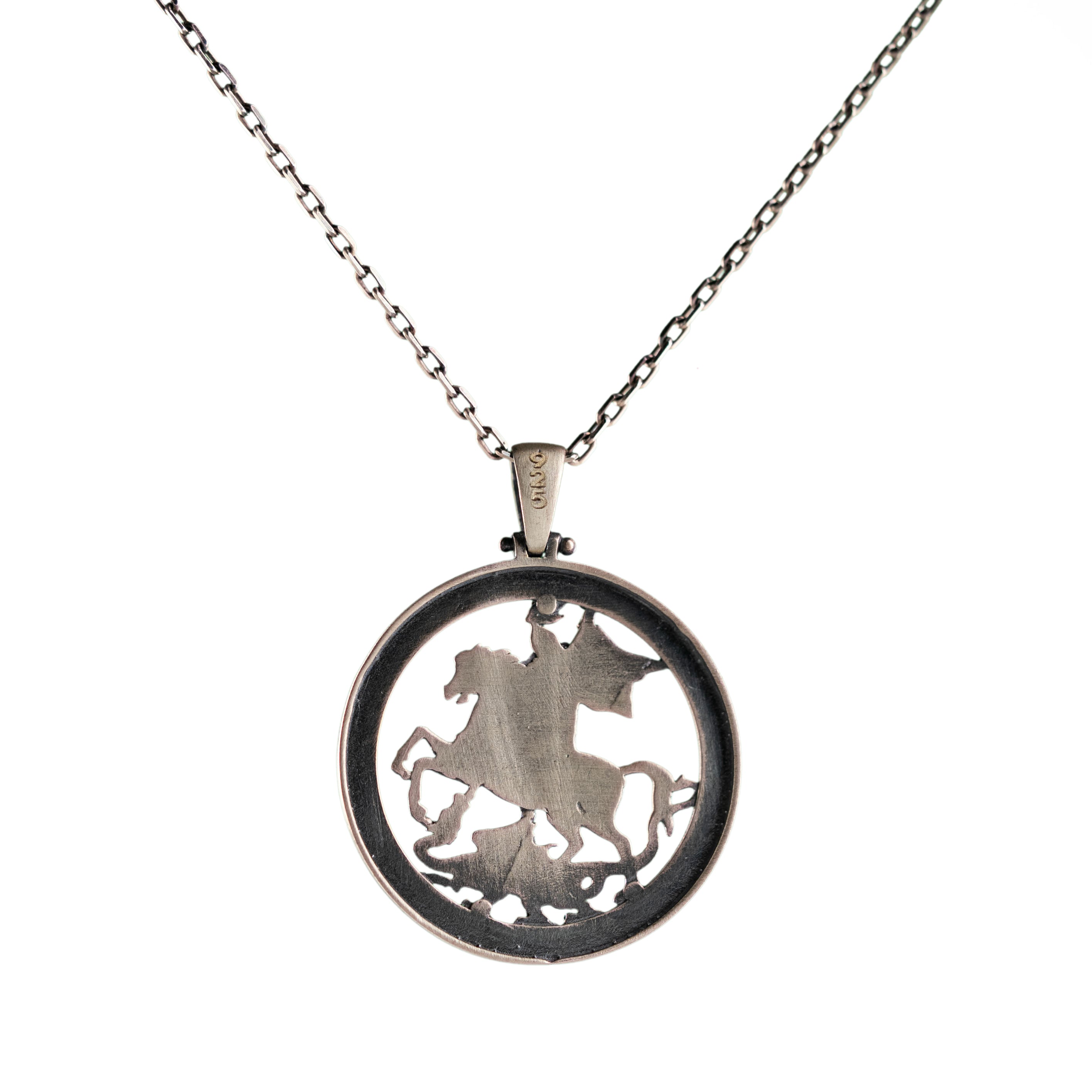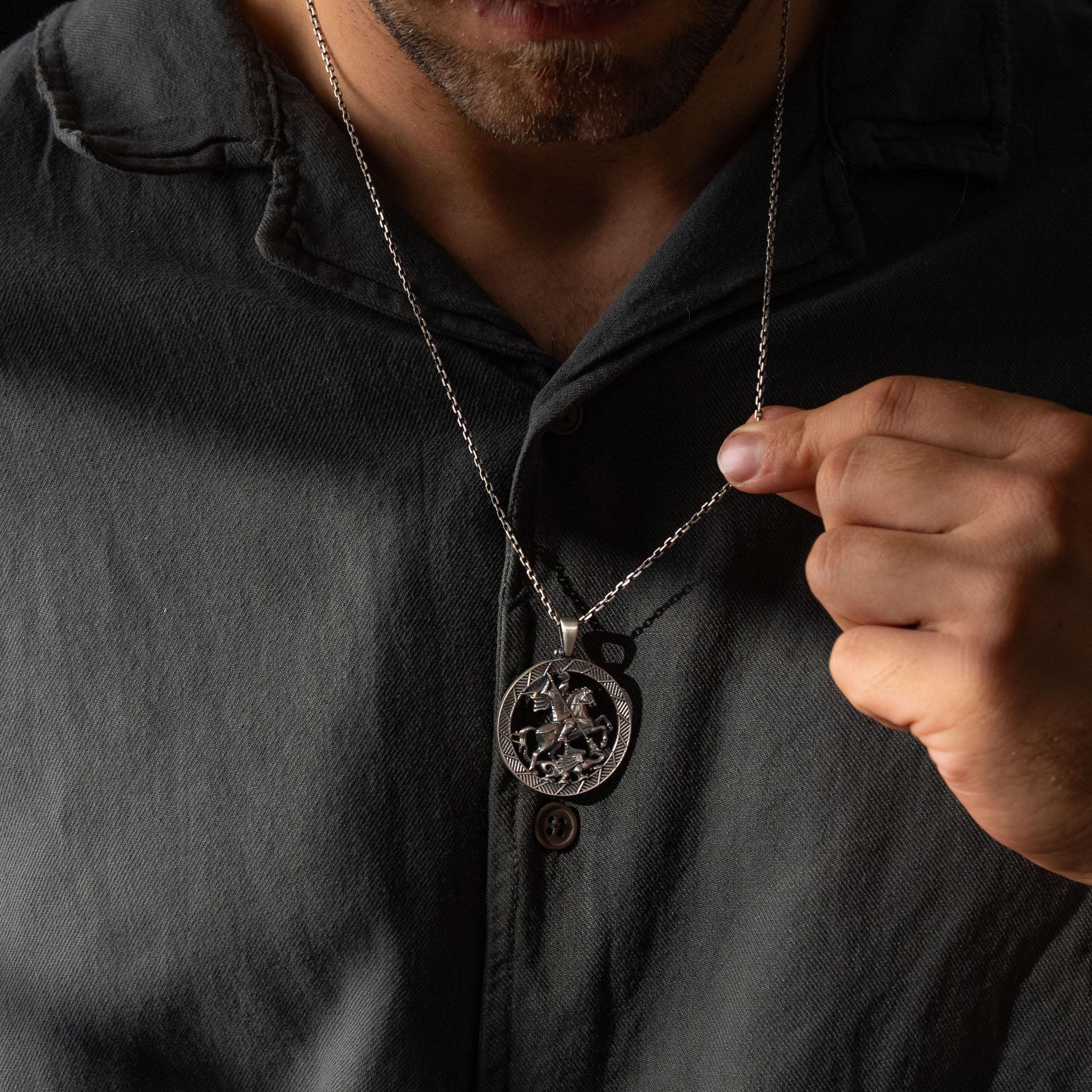 Handcrafted in 925 sterling silver, this Saint George and the Dragon pendant showcases exquisite engraving, polished and oxidized finishes, and meticulous detailing that elevates everyday wear into statement craftsmanship.