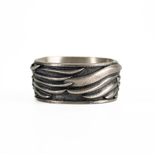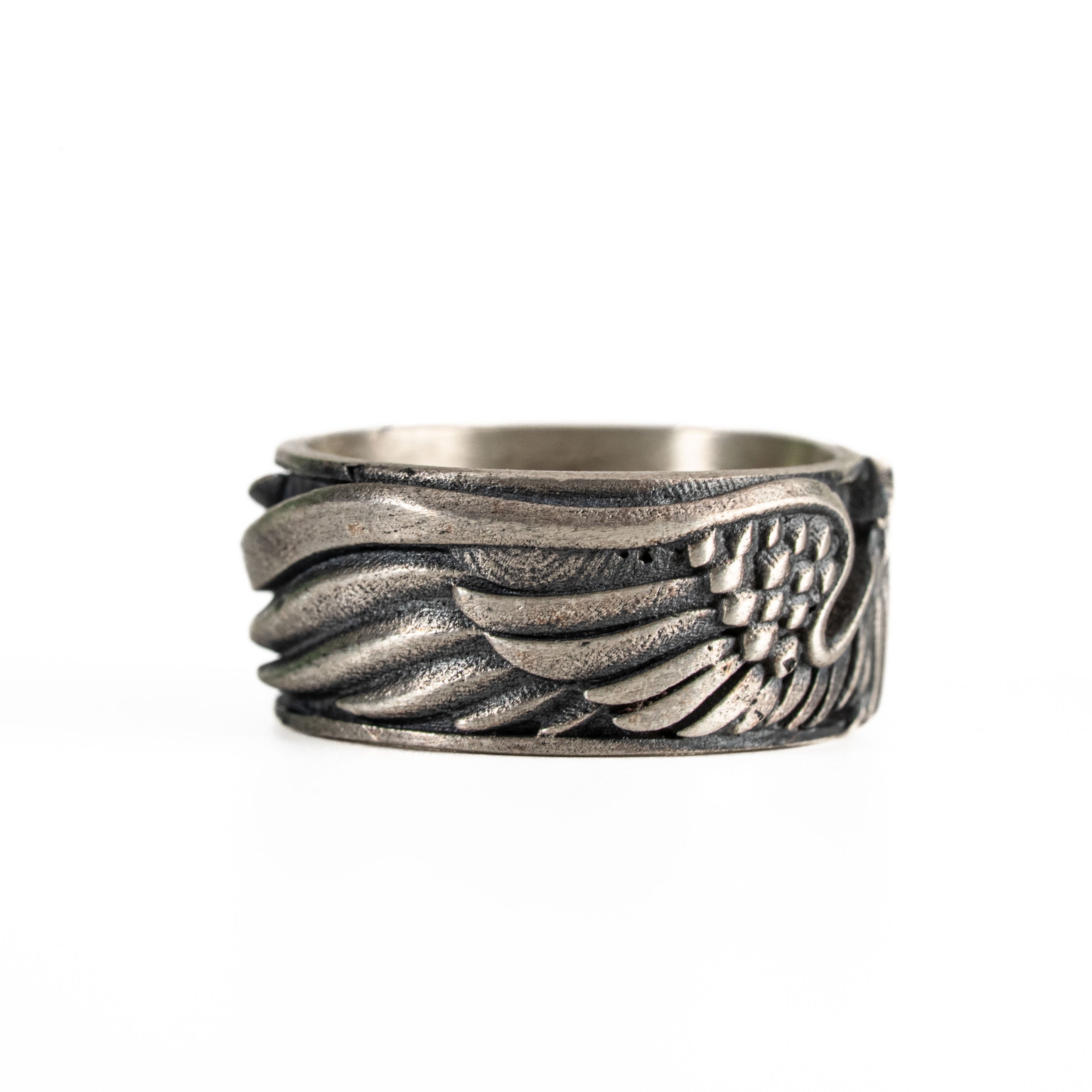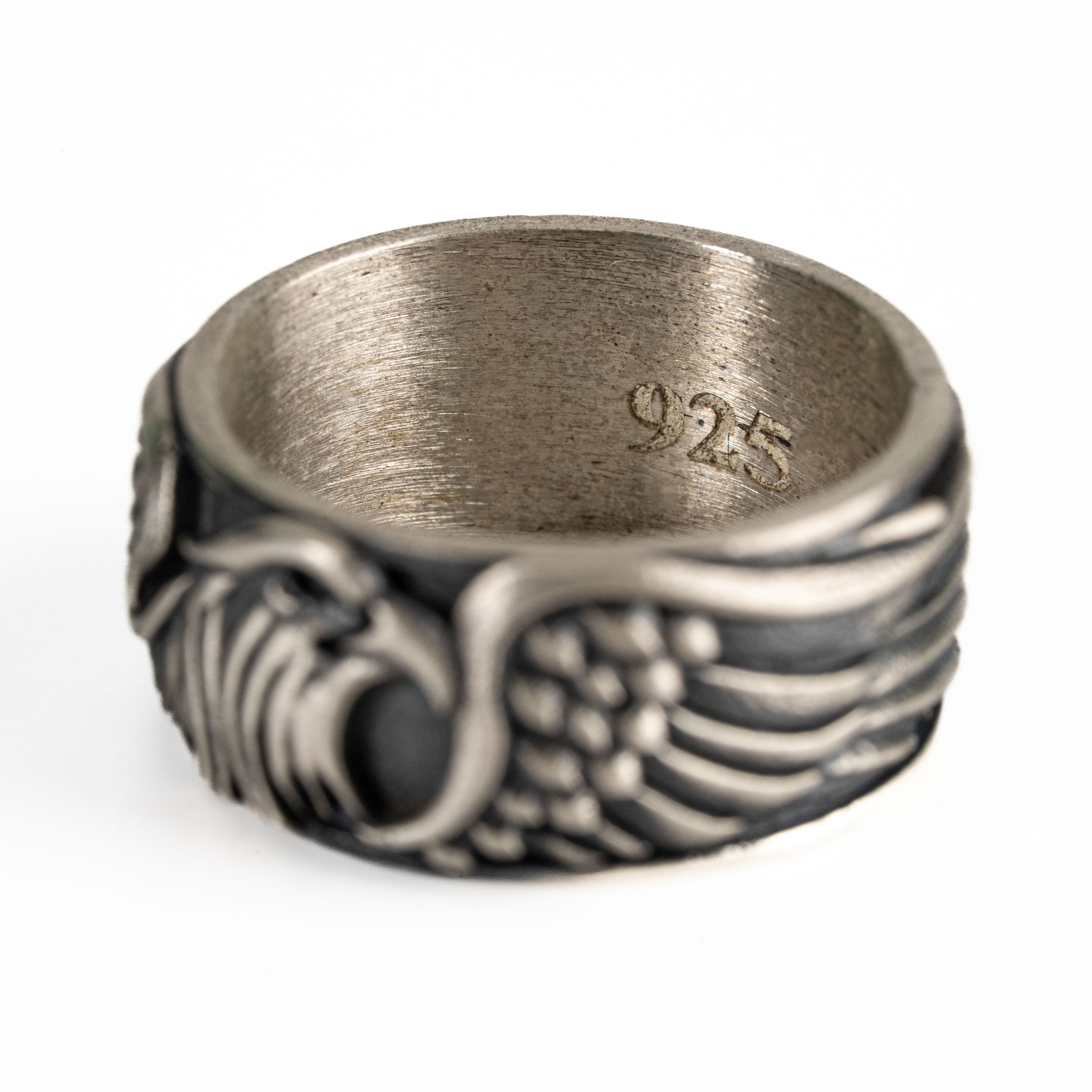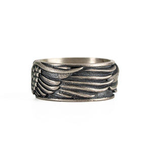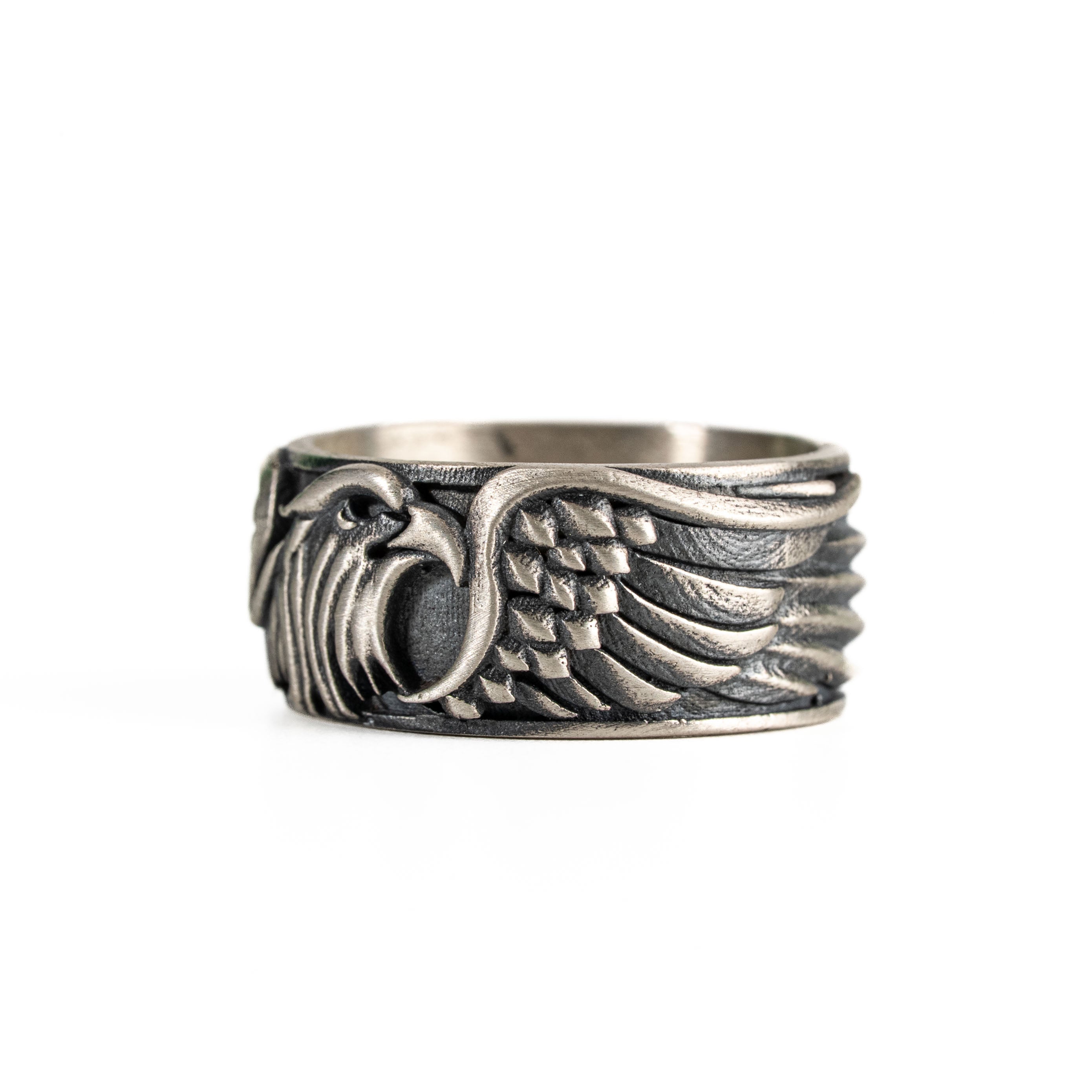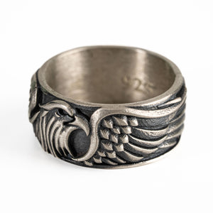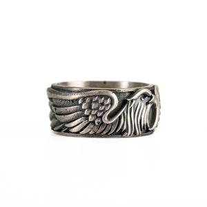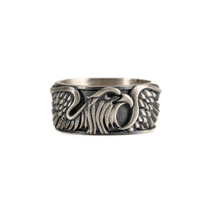 This ring features a detailed figurative aquiline motif with high-definition wing textures and a multi-dimensional structural profile. The design highlights professional-grade finishing techniques, creating a sharp visual contrast between high-polished surface highlights and specialized oxidized recesses that emphasize the intricate metalwork. Engineered for a balanced 8.18g weight and material integrity, this accessory provides a refined contemporary look focused on technical execution and durable craftsmanship for versatile daily wear.