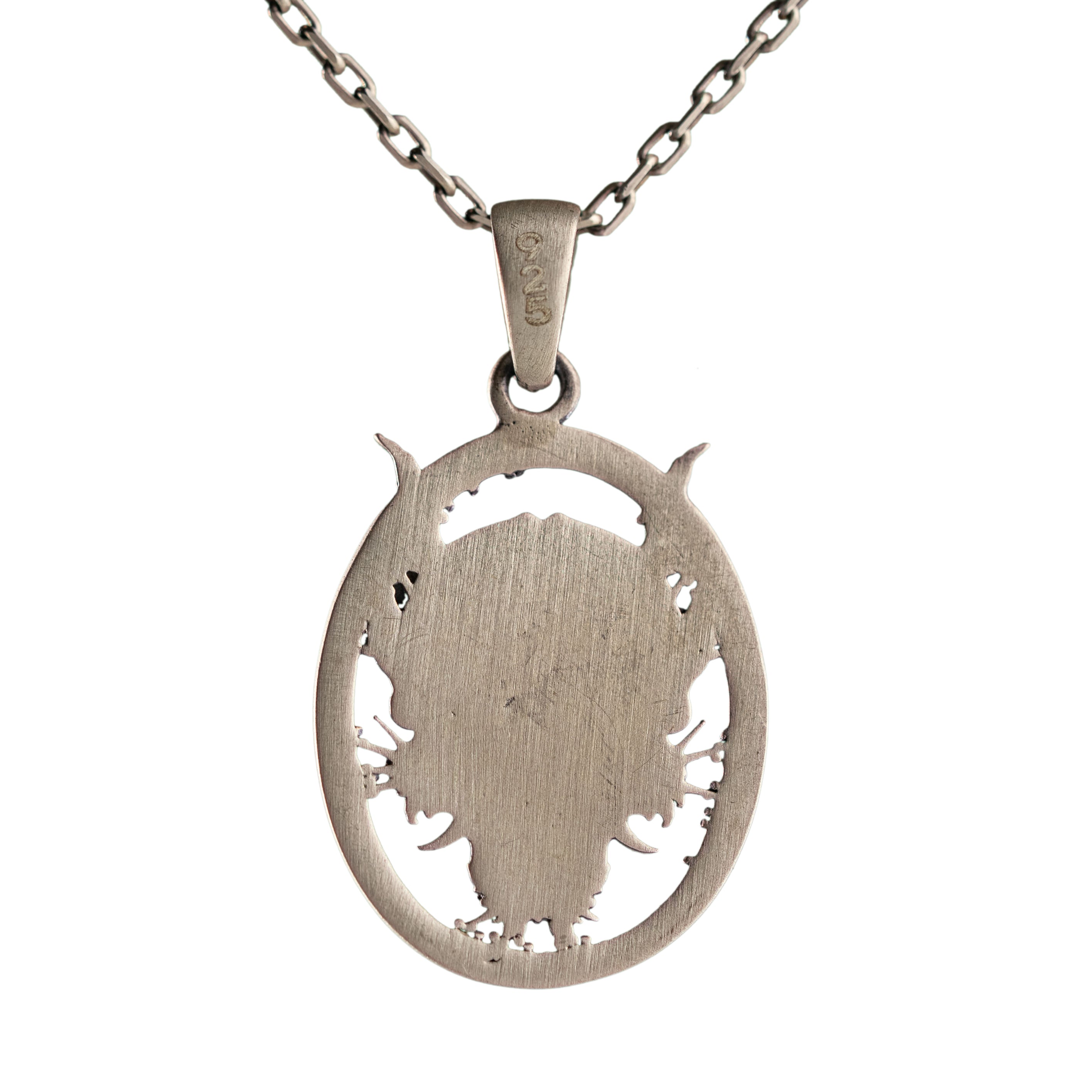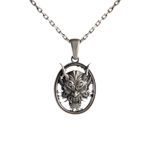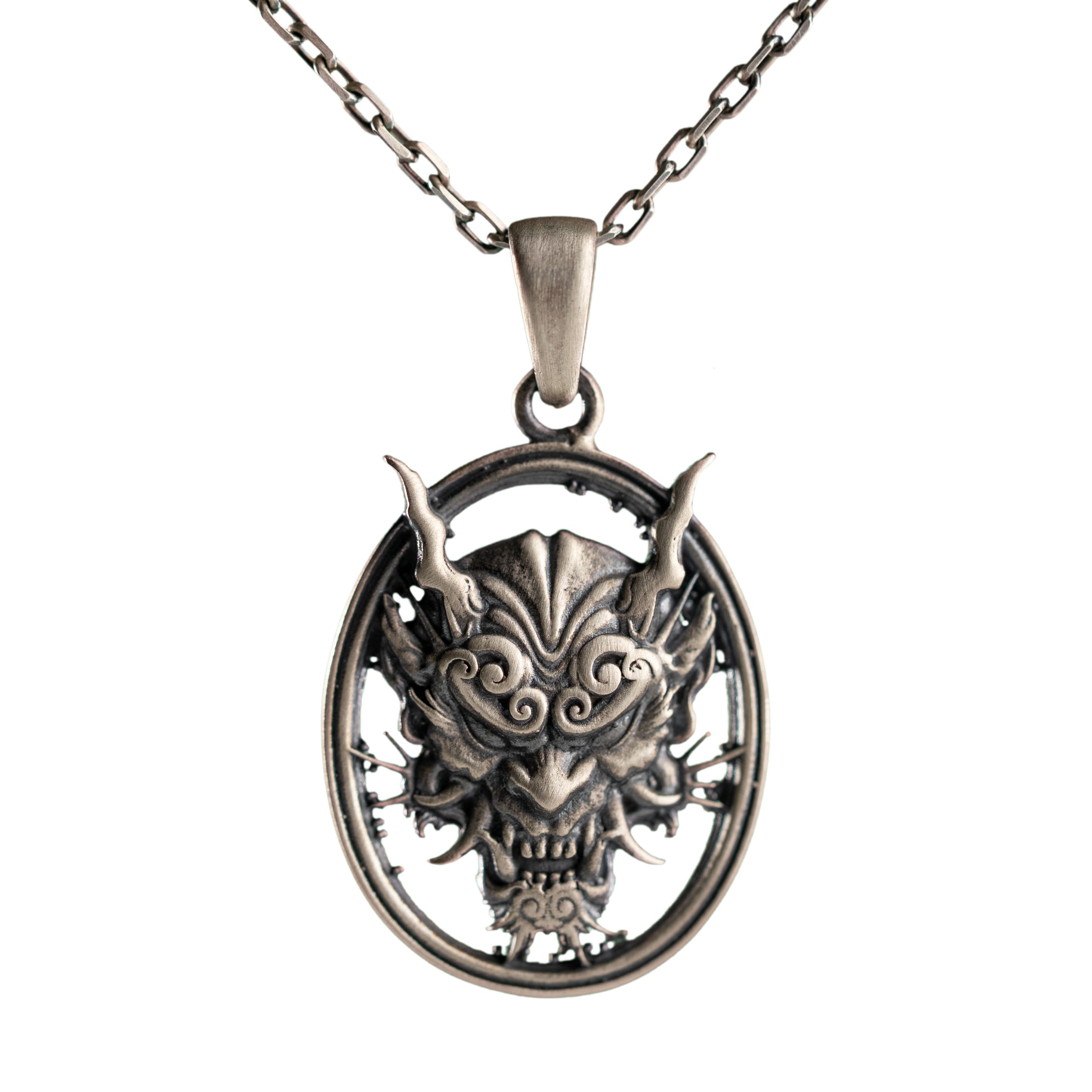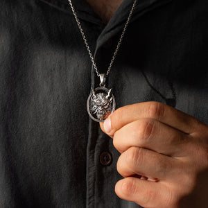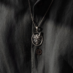 This necklace features a detailed figurative mask motif with high-definition surface textures and a multi-dimensional structural composition. The design highlights professional-grade finishing techniques, creating a sharp visual contrast between high-polished surface highlights and specialized oxidized recesses that emphasize the intricate metalwork. Engineered for a balanced weight and comfortable daily wear, this accessory provides a bold contemporary profile focused on technical execution and material integrity.