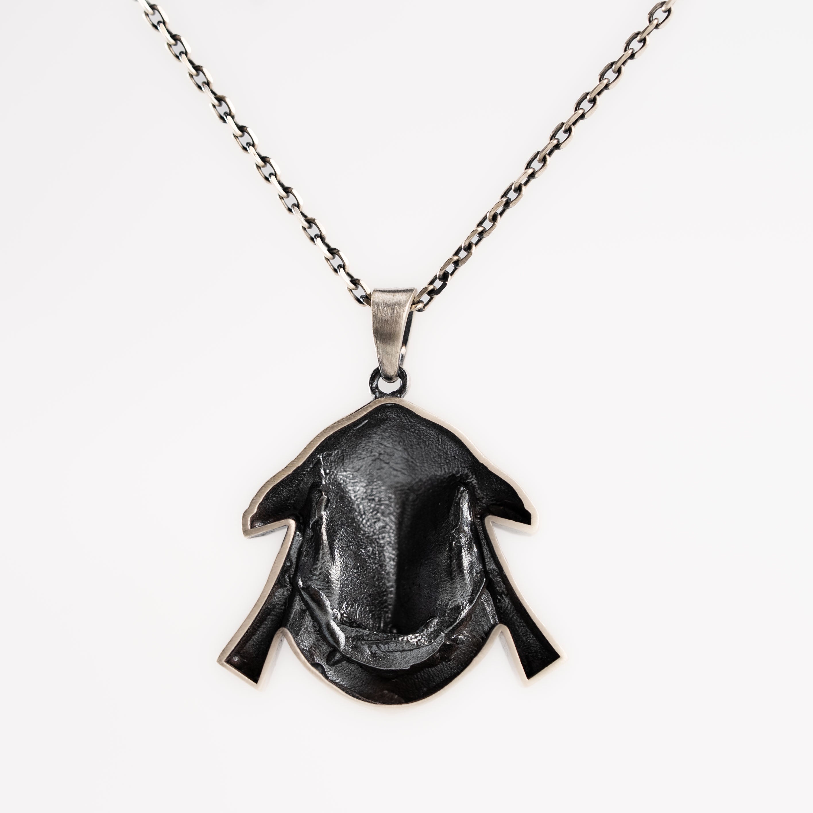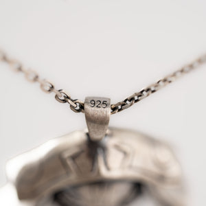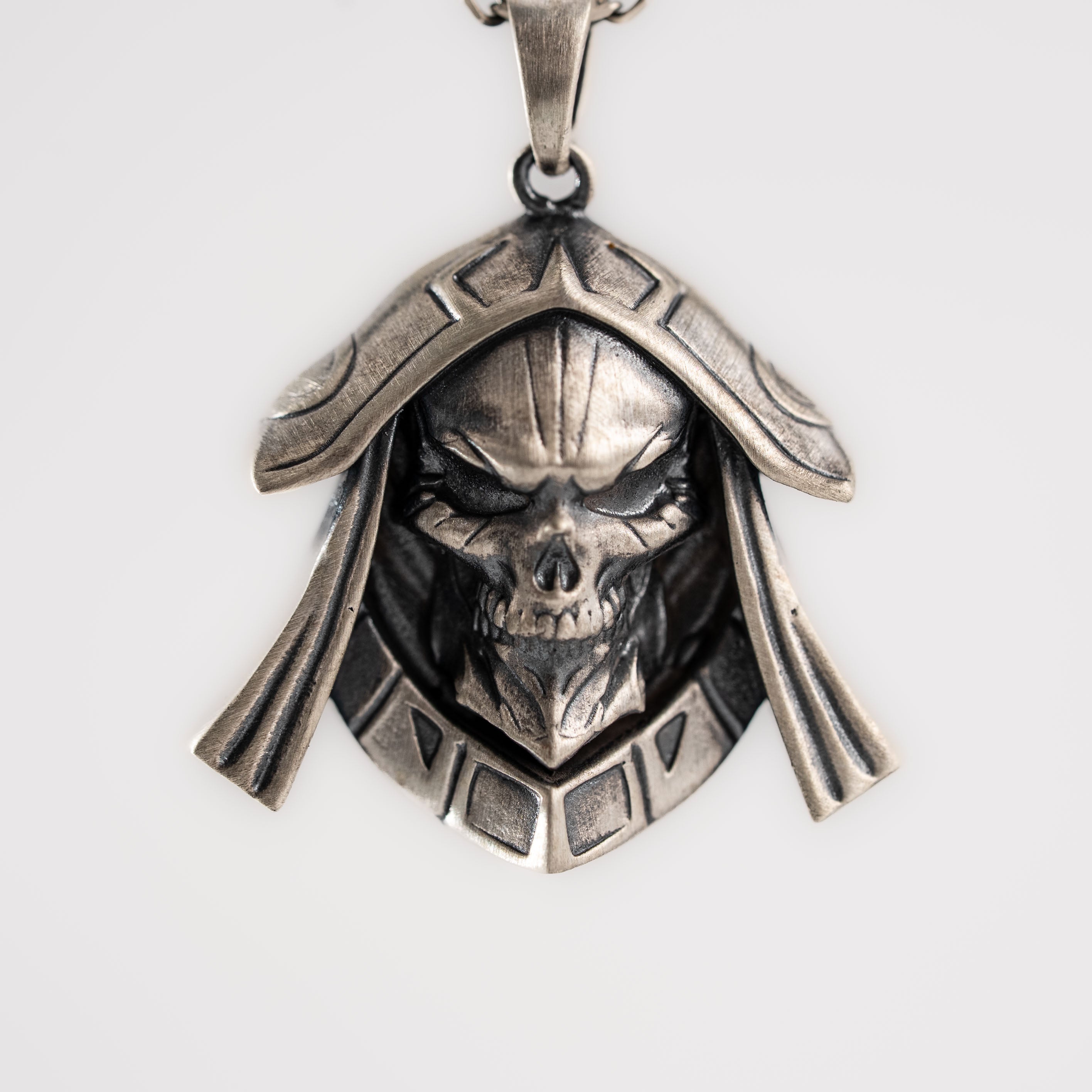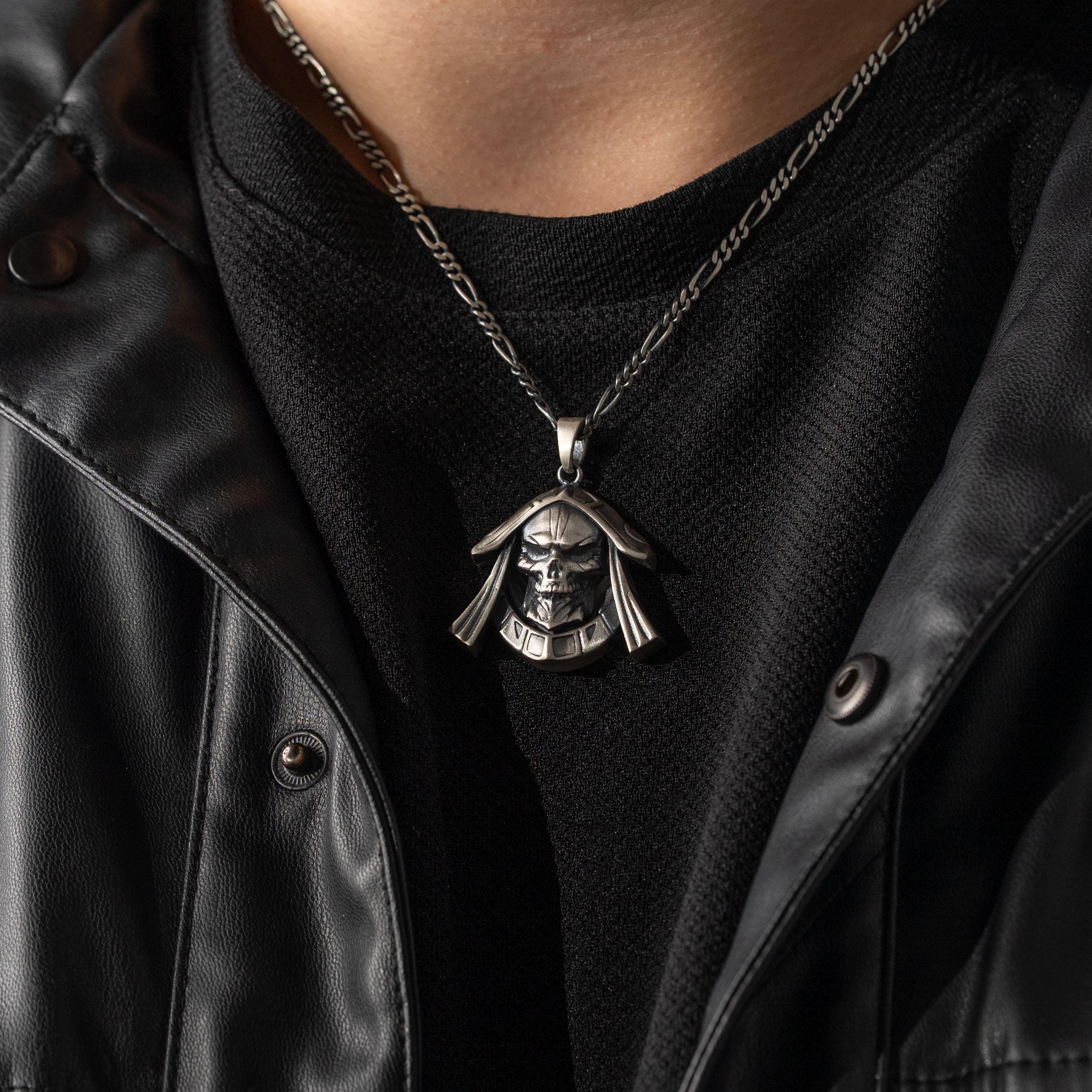 This necklace features an intricate figurative skull motif integrated with arcane crown elements, incorporating high-definition textures and a multi-dimensional structural profile. The design highlights professional-grade finishing techniques, creating a sharp visual contrast between high-polished surface highlights and specialized oxidized recesses that define the complex metalwork and Gothic fantasy iconography. Engineered for a substantial weight and material integrity in 925 sterling silver, this accessory provides a refined contemporary look focused on technical execution and durable craftsmanship for consistent daily wear.