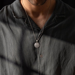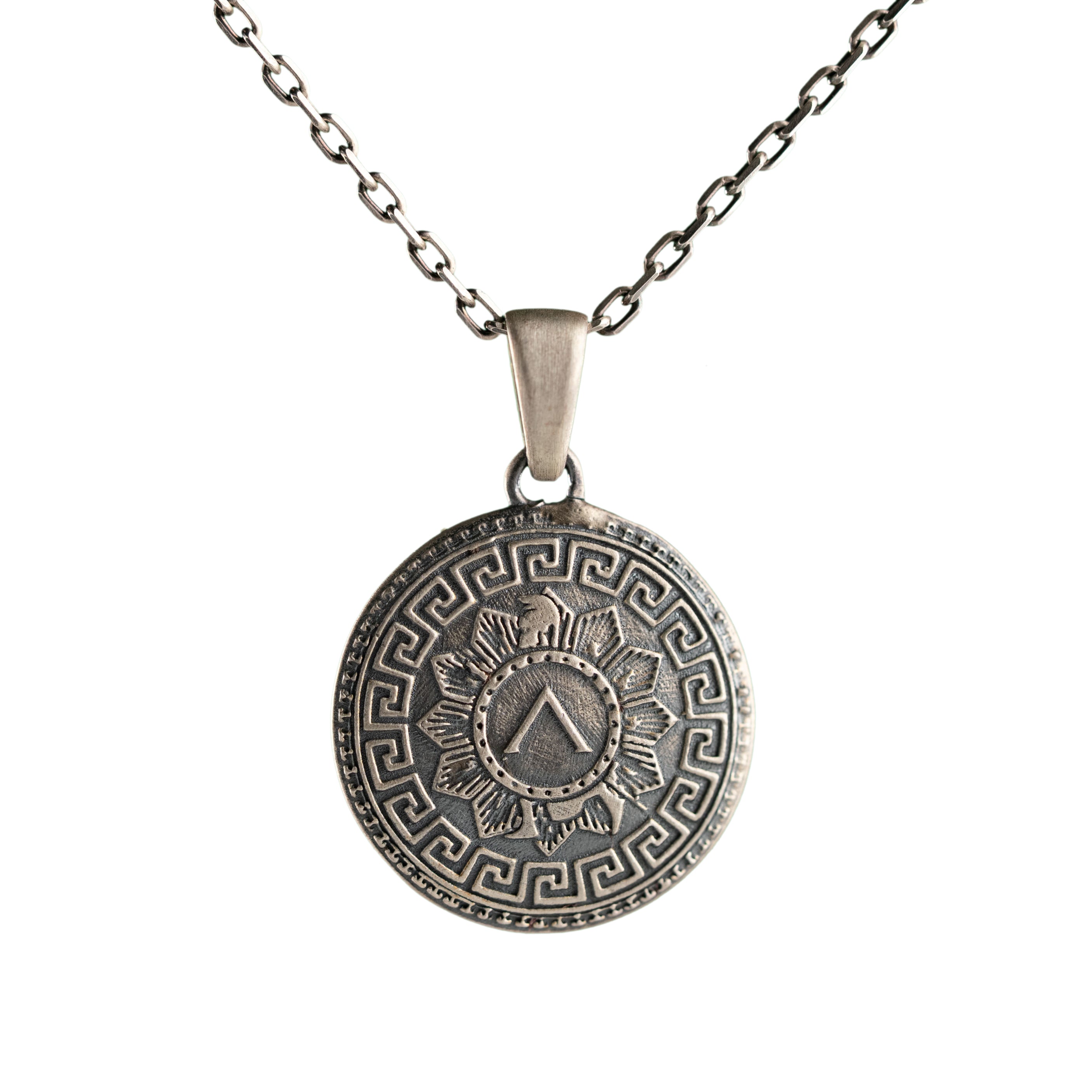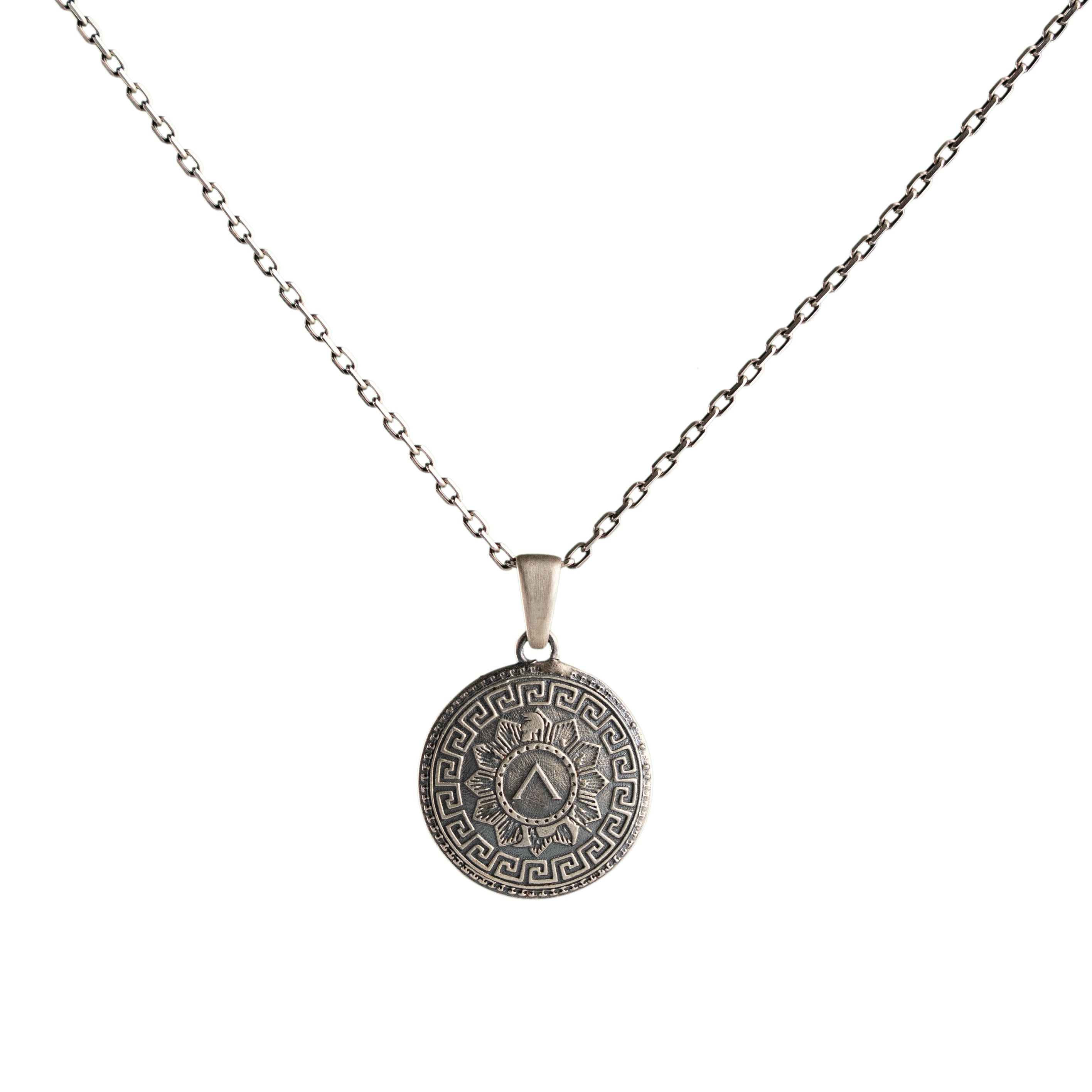 This necklace features an intricate figurative shield silhouette, incorporating high-definition surface textures and a multi-dimensional structural profile inspired by ancient martial iconography. The design highlights professional-grade finishing techniques, creating a sharp visual contrast between high-polished surface highlights and specialized oxidized recesses that define the complex metalwork and traditional Greek warrior elements. Engineered for material integrity in 925 sterling silver, this accessory provides a refined contemporary look focused on technical execution and durable craftsmanship for consistent daily wear.
