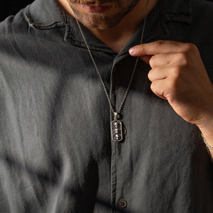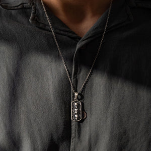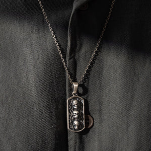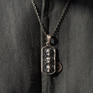 This necklace features a detailed figurative motif depicting three distinct skeletal elements, showcasing high-definition surface textures and a multi-dimensional structural profile. The design highlights professional-grade finishing techniques, creating a sharp visual contrast between high-polished surface highlights and specialized oxidized recesses that emphasize the intricate metalwork. Engineered for a balanced weight and material integrity, this accessory provides a bold contemporary look focused on technical execution and durable craftsmanship for versatile daily wear.