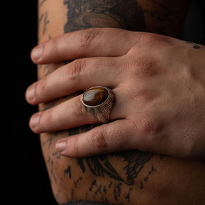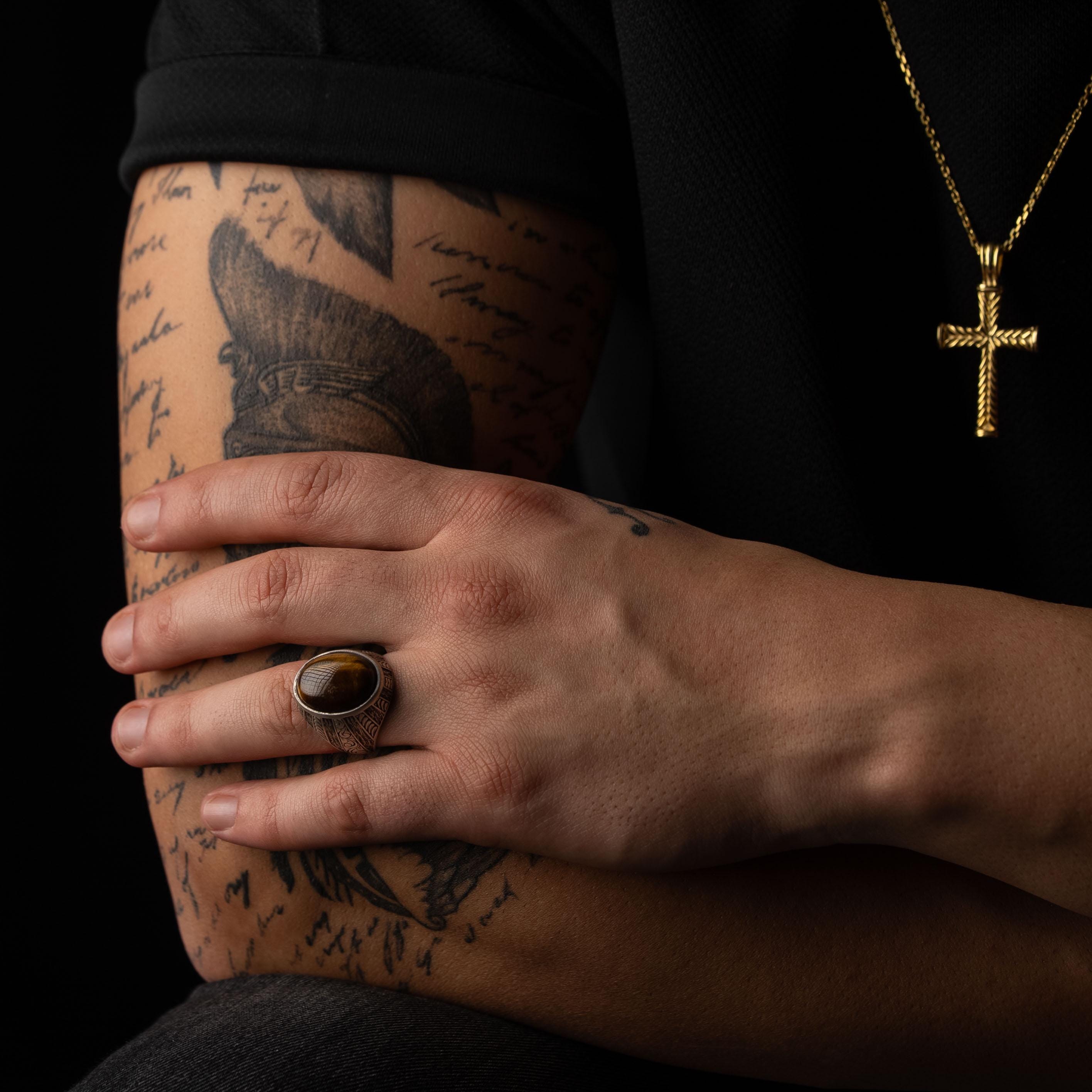 This ring features an intricate figurative silhouette integrated with a natural Tiger's Eye cabochon setting, incorporating high-definition floral surface textures and a multi-dimensional structural profile. The design highlights professional-grade finishing techniques, creating a sharp visual contrast between high-polished surface highlights and specialized oxidized recesses that define the complex metalwork and traditional botanical iconography. Engineered for a bold signet volume and material integrity in 925 sterling silver, this accessory provides a refined contemporary look focused on technical execution and durable craftsmanship for consistent daily wear.