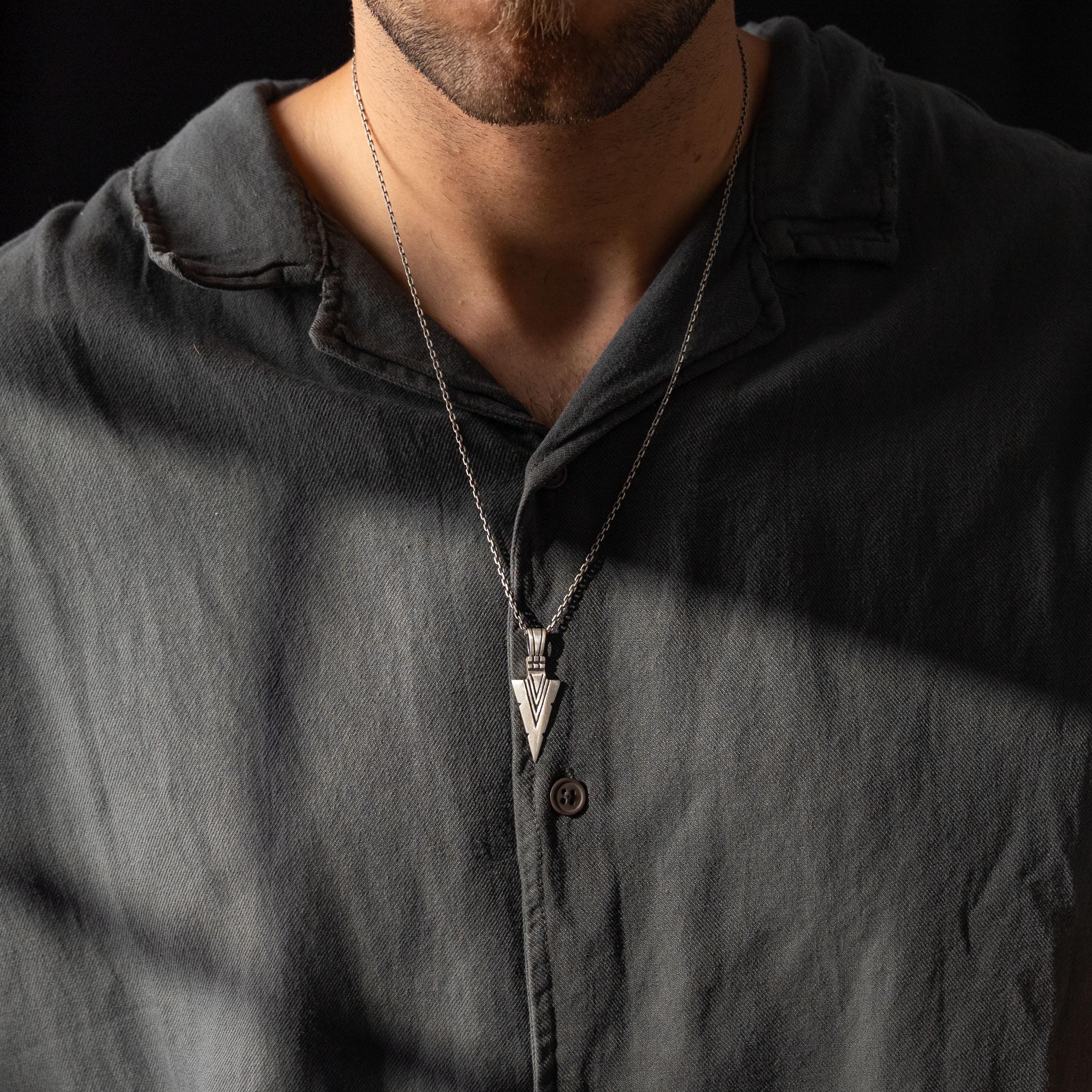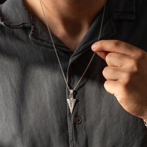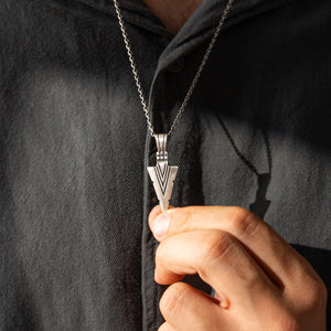 This necklace features an intricate figurative arrowhead motif, incorporating high-definition textures and a multi-dimensional structural profile. The design highlights professional-grade finishing techniques, creating a sharp visual contrast between high-polished surface highlights and specialized oxidized recesses that define the complex metalwork and Norse warrior iconography. Engineered for a balanced weight and material integrity in 925 sterling silver, this accessory provides a refined contemporary look focused on technical execution and durable craftsmanship for consistent daily wear.