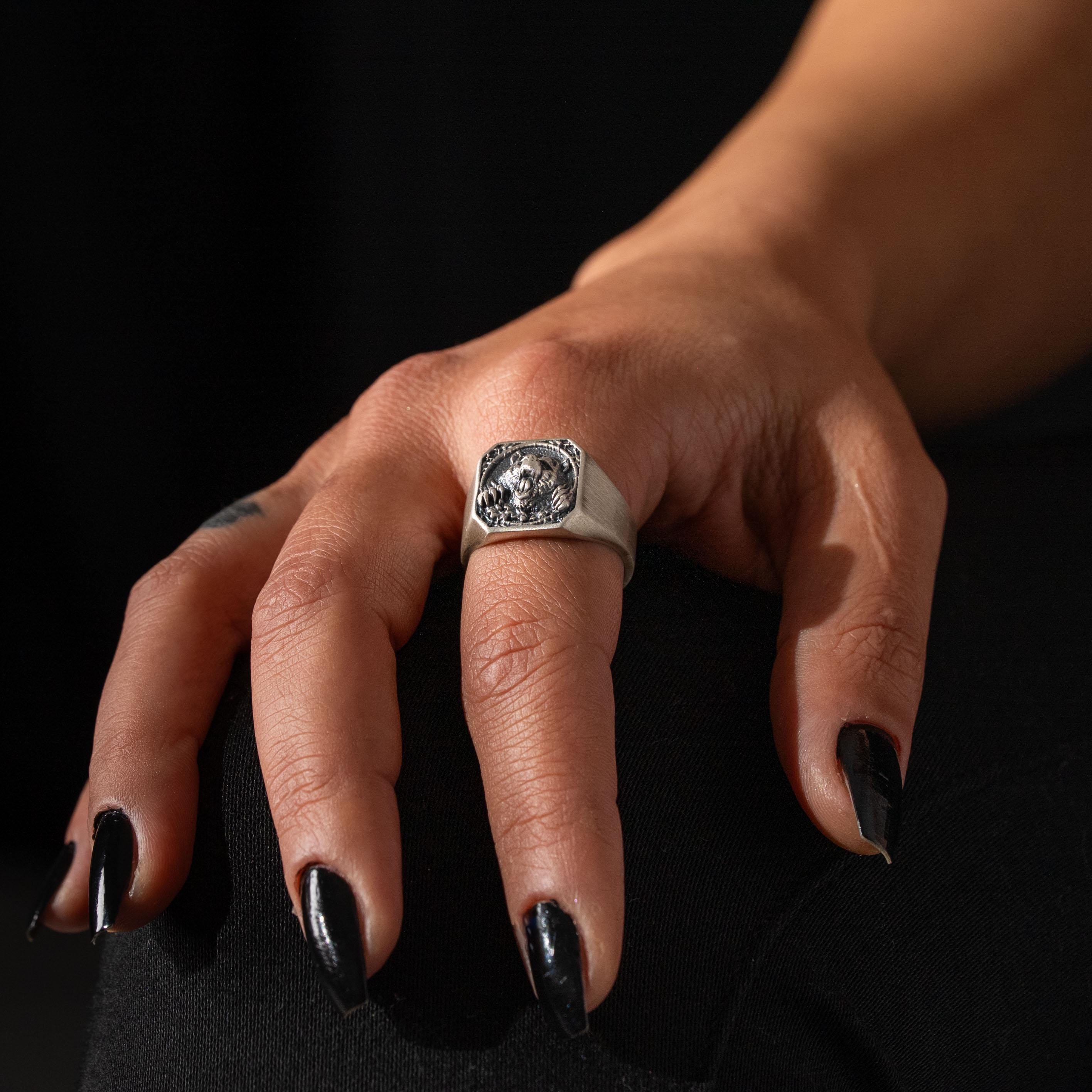 This ring features an intricate figurative bear motif, incorporating high-definition fur textures and a multi-dimensional structural profile inspired by Norse iconography. The design highlights professional-grade finishing techniques, creating a sharp visual contrast between high-polished surface highlights and specialized oxidized recesses that define the complex metalwork and ancestral totem elements. Engineered for a balanced weight and material integrity in 925 sterling silver, this accessory provides a refined contemporary look focused on technical execution and durable craftsmanship for consistent daily wear.