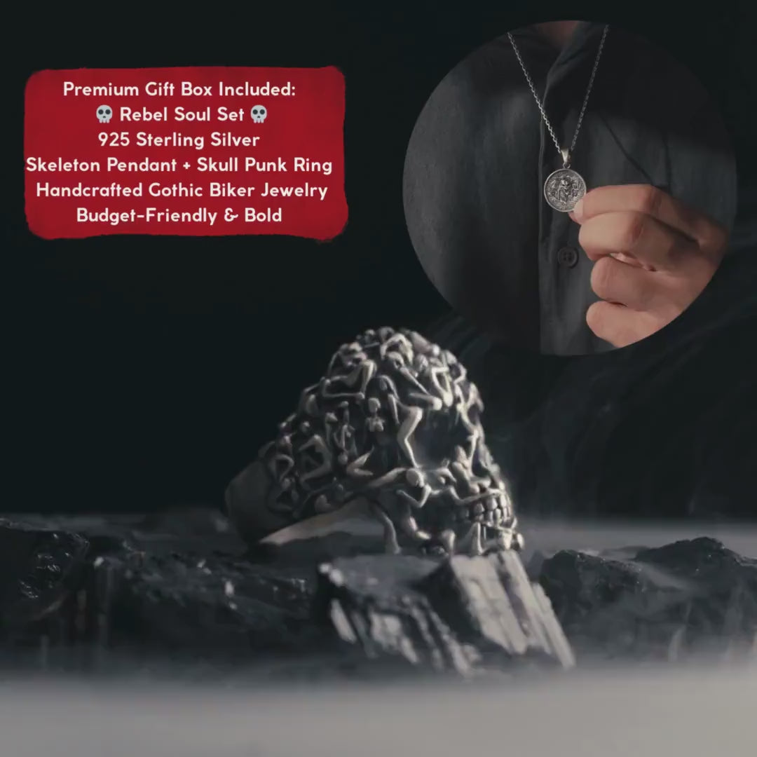 Unisex 925 Sterling Silver Skull Jewelry Set – Handmade Gothic Biker Ring & Skeleton Necklace